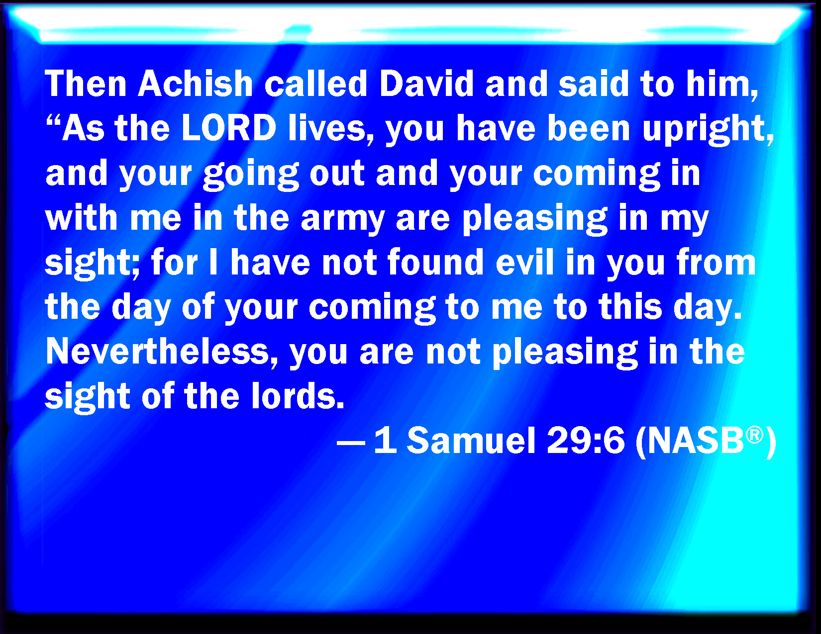 Bible Verse Slide 1 Samuel 29:6 Then Achish called David, and said to him, Surely, as the LORD lives, you have been upright, and your going out and your coming in with me in the host is good in my sight: for I have not found evil in you since the day of your coming to me to this day: nevertheless the lords favor you not. KJV: Then Achish called David, and said unto him, Surely, as the LORD liveth, thou hast been upright, and thy going out and thy coming in with me in the host is good in my sight: for I have not found evil in thee since the day of thy coming unto me unto this day: nevertheless the lords favour thee not. DRB: Then Achis called David, and said to him: As the Lord liveth, thou art upright and good in my sight: and so is thy going out, and thy coming in with me in the army: and I have not found my evil in thee, since the day that thou camest to me unto this day: but thou pleasest not the lords. DBT: And Achish called David, and said to him, As Jehovah liveth, thou art upright, and thy going out and thy coming in with me in the camp is acceptable to me; for I have not found evil in thee since the day of thy coming to me to this day; but thou art not acceptable to the lords. ERV: Then Achish called David, and said unto him, As the LORD liveth, thou hast been upright, and thy going out and thy coming in with me in the host is good in my sight: for I have not found evil in thee since the day of thy coming unto me unto this day: nevertheless the lords favour thee not. WBT: Then Achish called David, and said to him, Surely, as the LORD liveth, thou hast been upright, and thy going out and thy coming in with me in the host is good in my sight: for I have not found evil in thee from the day of thy coming to me to this day: nevertheless the lords favor thee not. WEB: Then Achish called David, and said to him, "As Yahweh lives, you have been upright, and your going out and your coming in with me in the army is good in my sight; for I have not found evil in you since the day of your coming to me to this day. Nevertheless, the lords don't favor you. YLT: And Achish calleth unto David, and saith unto him, 'Jehovah liveth, surely thou art upright, and good in mine eyes is thy going out, and thy coming in, with me in the camp, for I have not found in thee evil from the day of thy coming in unto me till this day; and in the eyes of the princes thou art not good;Links 1 Samuel 29:6 NIV • 1 Samuel 29:6 NLT • 1 Samuel 29:6 ESV • 1 Samuel 29:6 NASB • 1 Samuel 29:6 KJV • 1 Samuel 29:6 Interlinear • 1 Samuel 29:6 Commentaries • 1 Samuel 29:6 Parallel Texts • 1 Samuel 29:6 Bible Apps • 1 Samuel 29:6 Parallel • Bible Hub |
