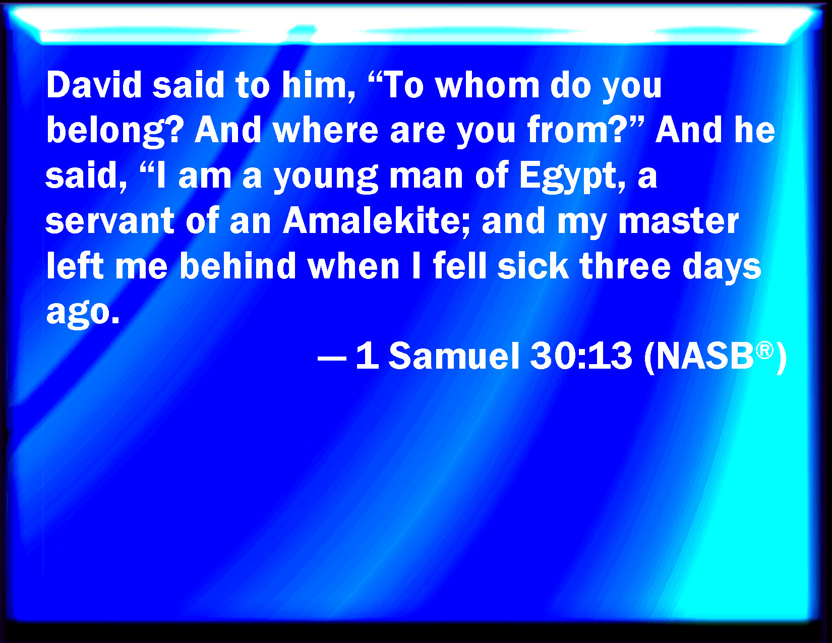 Bible Verse Slide 1 Samuel 30:13 And David said to him, To whom belong you? and from where are you? And he said, I am a young man of Egypt, servant to an Amalekite; and my master left me, because three days ago I fell sick. KJV: And David said unto him, To whom belongest thou? and whence art thou? And he said, I am a young man of Egypt, servant to an Amalekite; and my master left me, because three days agone I fell sick. DRB: And David said to him: To whom dost thou belong? or whence dost thou come? and whither art thou going? He said: I am a young man of Egypt, the servant of an Amalecite, and my master left me, because I began to be sick three days ago. DBT: And David said to him, To whom belongest thou? and whence art thou? And he said, I am a young man of Egypt, servant of an Amalekite; and my master left me, because three days ago I fell sick. ERV: And David said unto him, To whom belongest thou? and whence art thou? And he said, I am a young man of Egypt, servant to an Amalekite; and my master left me, because three days agone I fell sick. WBT: And David said to him, To whom belongest thou? and whence art thou? And he said, I am a young man of Egypt, servant to an Amalekite; and my master left me, because three days ago I fell sick. WEB: David asked him, "To whom do you belong? Where are you from?" He said, "I am a young man of Egypt, servant to an Amalekite; and my master left me, because three days ago I fell sick. YLT: And David saith to him, 'Whose art thou? and whence art thou?' And he saith, 'An Egyptian youth I am, servant to a man, an Amalekite, and my lord forsaketh me, for I have been sick three days,Links 1 Samuel 30:13 NIV • 1 Samuel 30:13 NLT • 1 Samuel 30:13 ESV • 1 Samuel 30:13 NASB • 1 Samuel 30:13 KJV • 1 Samuel 30:13 Interlinear • 1 Samuel 30:13 Commentaries • 1 Samuel 30:13 Parallel Texts • 1 Samuel 30:13 Bible Apps • 1 Samuel 30:13 Parallel • Bible Hub |