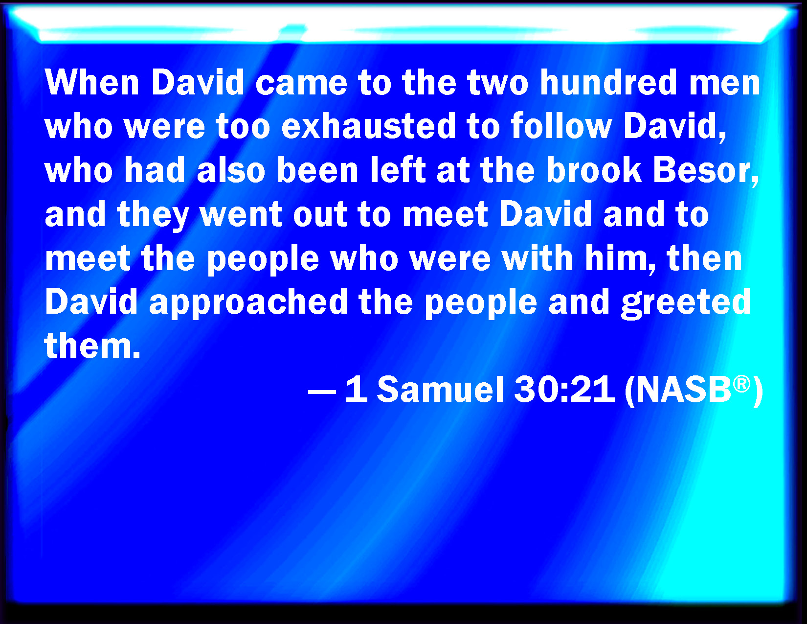 Bible Verse Slide 1 Samuel 30:21 And David came to the two hundred men, which were so faint that they could not follow David, whom they had made also to abide at the brook Besor: and they went forth to meet David, and to meet the people that were with him: and when David came near to the people, he saluted them. KJV: And David came to the two hundred men, which were so faint that they could not follow David, whom they had made also to abide at the brook Besor: and they went forth to meet David, and to meet the people that were with him: and when David came near to the people, he saluted them. DRB: And David came to the two hundred men, who being weary had stayed, and were not able to follow David, and he had ordered them to abide at the torrent Besor: and they came out to meet David, and the people that were with him. And David coming to the people saluted them peaceably. DBT: And David came to the two hundred men who had been too exhausted to follow David, and whom they had left behind at the torrent Besor; and they went forth to meet David, and to meet the people that were with him; and David drew near to the people and saluted them. ERV: And David came to the two hundred men, which were so faint that they could not follow David, whom also they had made to abide at the brook Besor: and they went forth to meet David, and to meet the people that were with him: and when David came near to the people, he saluted them. WBT: And David came to the two hundred men, who were so faint that they could not follow David, whom they had made also to abide at the brook Besor: and they went forth to meet David, and to meet the people that were with him: and when David came near to the people, he saluted them. WEB: David came to the two hundred men, who were so faint that they could not follow David, whom also they had made to stay at the brook Besor; and they went forth to meet David, and to meet the people who were with him. When David came near to the people, he greeted them. YLT: And David cometh in unto the two hundred men who were too faint to go after David, and whom they cause to abide at the brook of Besor, and they go out to meet David, and to meet the people who are with him, and David approacheth the people, and asketh of them of welfare.Links 1 Samuel 30:21 NIV • 1 Samuel 30:21 NLT • 1 Samuel 30:21 ESV • 1 Samuel 30:21 NASB • 1 Samuel 30:21 KJV • 1 Samuel 30:21 Interlinear • 1 Samuel 30:21 Commentaries • 1 Samuel 30:21 Parallel Texts • 1 Samuel 30:21 Bible Apps • 1 Samuel 30:21 Parallel • Bible Hub |