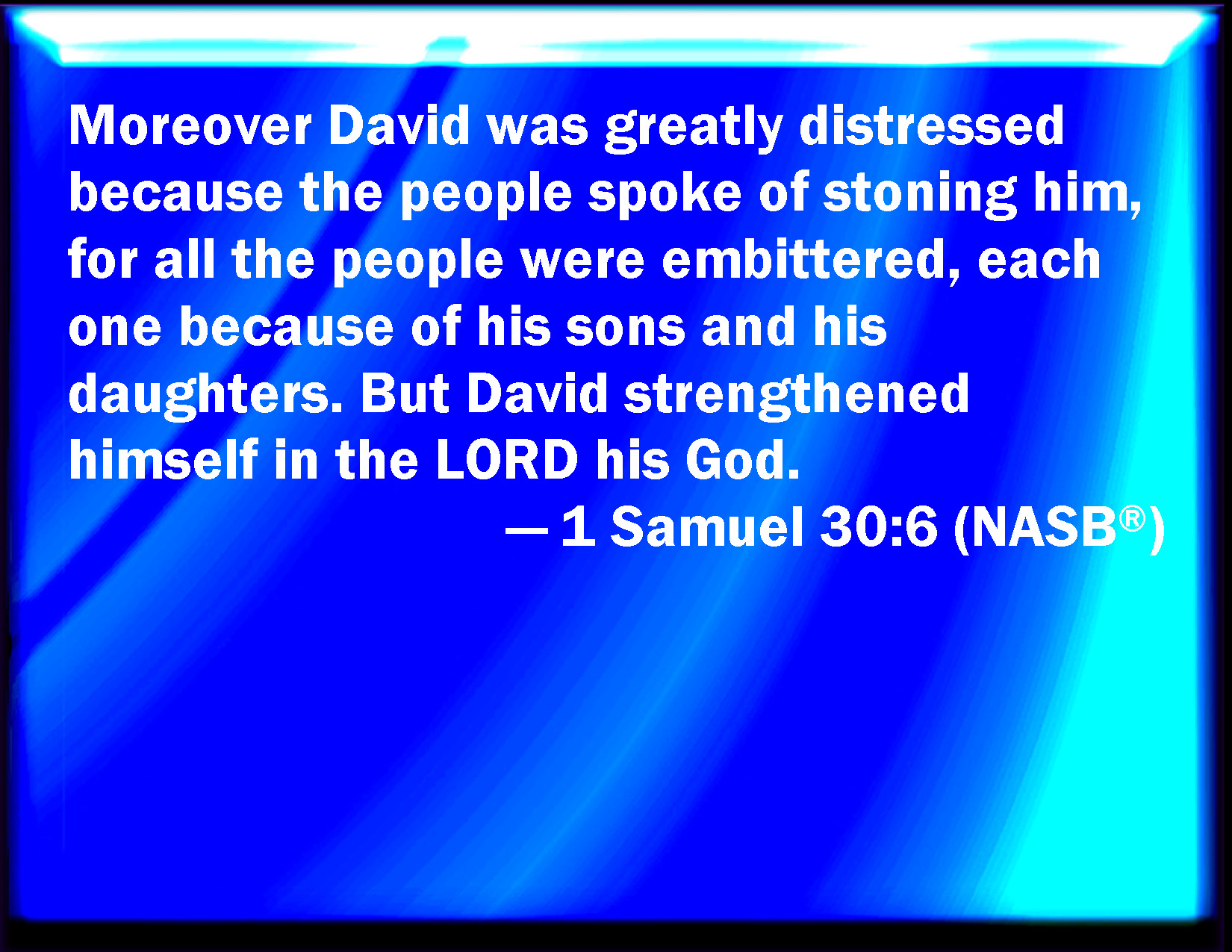 Bible Verse Slide 1 Samuel 30:6 And David was greatly distressed; for the people spoke of stoning him, because the soul of all the people was grieved, every man for his sons and for his daughters: but David encouraged himself in the LORD his God. KJV: And David was greatly distressed; for the people spake of stoning him, because the soul of all the people was grieved, every man for his sons and for his daughters: but David encouraged himself in the LORD his God. DRB: And David was greatly afflicted: for the people had a mind to stone him, for the soul of every man was bitterly grieved for his sons, and daughters: but David took courage in the Lord his God. DBT: And David was greatly distressed; for the people spoke of stoning him; for the soul of all the people was embittered, every man because of his sons and because of his daughters; but David strengthened himself in Jehovah his God. ERV: And David was greatly distressed; for the people spake of stoning him, because the soul of all the people was grieved, every man for his sons and for his daughters: but David strengthened himself in the LORD his God. WBT: And David was greatly distressed: for the people spoke of stoning him, because the soul of all the people was grieved, every man for his sons, and for his daughters: but David encouraged himself in the LORD his God. WEB: David was greatly distressed; for the people spoke of stoning him, because the soul of all the people was grieved, every man for his sons and for his daughters: but David strengthened himself in Yahweh his God. YLT: and David hath great distress, for the people have said to stone him, for the soul of all the people hath been bitter, each for his sons and for his daughters; and David doth strengthen himself in Jehovah his God.Links 1 Samuel 30:6 NIV • 1 Samuel 30:6 NLT • 1 Samuel 30:6 ESV • 1 Samuel 30:6 NASB • 1 Samuel 30:6 KJV • 1 Samuel 30:6 Interlinear • 1 Samuel 30:6 Commentaries • 1 Samuel 30:6 Parallel Texts • 1 Samuel 30:6 Bible Apps • 1 Samuel 30:6 Parallel • Bible Hub |