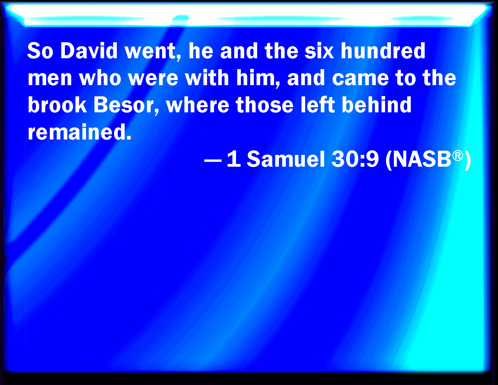 Bible Verse Slide 1 Samuel 30:9 So David went, he and the six hundred men that were with him, and came to the brook Besor, where those that were left behind stayed. KJV: So David went, he and the six hundred men that were with him, and came to the brook Besor, where those that were left behind stayed. DRB: So David went, he and the six hundred men that were with him, and they came to the torrent Besor: and some being weary stayed there. DBT: So David went, he and the six hundred men that were with him, and they came to the torrent Besor; and those that were left stayed behind. ERV: So David went, he and the six hundred men that were with him, and came to the brook Besor, where those that were left behind stayed. WBT: So David went, he and the six hundred men that were with him, and came to the brook Besor, where those that were left behind remained. WEB: So David went, he and the six hundred men who were with him, and came to the brook Besor, where those who were left behind stayed. YLT: And David goeth on, he and six hundred men who are with him, and they come in unto the brook of Besor, and those left have stood still,Links 1 Samuel 30:9 NIV • 1 Samuel 30:9 NLT • 1 Samuel 30:9 ESV • 1 Samuel 30:9 NASB • 1 Samuel 30:9 KJV • 1 Samuel 30:9 Interlinear • 1 Samuel 30:9 Commentaries • 1 Samuel 30:9 Parallel Texts • 1 Samuel 30:9 Bible Apps • 1 Samuel 30:9 Parallel • Bible Hub |