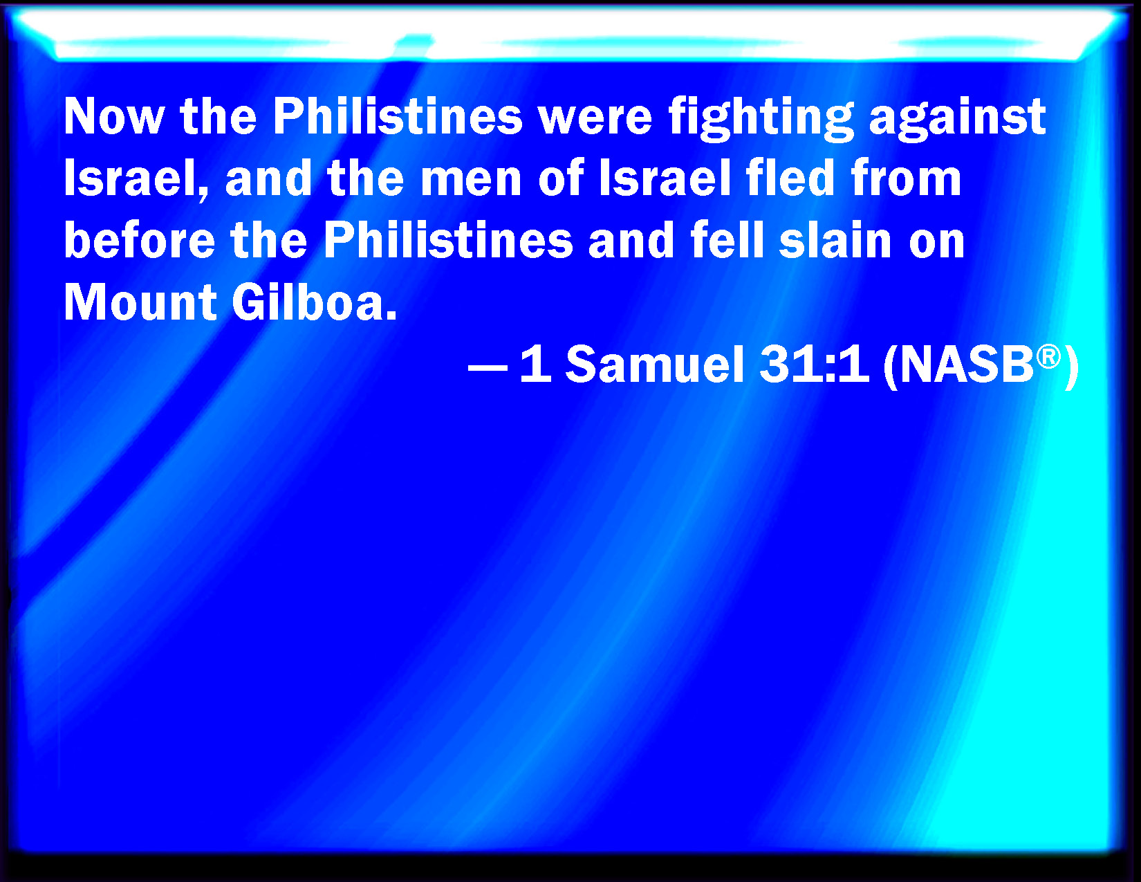 Bible Verse Slide 1 Samuel 31:1 Now the Philistines fought against Israel: and the men of Israel fled from before the Philistines, and fell down slain in mount Gilboa. KJV: Now the Philistines fought against Israel: and the men of Israel fled from before the Philistines, and fell down slain in mount Gilboa. DRB: And the Philistines fought against Israel, and the men of Israel fled from before the Philistines, and fell down slain in mount Gelboe. DBT: And the Philistines fought against Israel; and the men of Israel fled from before the Philistines, and fell down slain on mount Gilboa. ERV: Now the Philistines fought against Israel: and the men of Israel fled from before the Philistines, and fell down slain in mount Gilboa. WBT: Now the Philistines fought against Israel: and the men of Israel fled from before the Philistines, and fell down slain in mount Gilboa. WEB: Now the Philistines fought against Israel: and the men of Israel fled from before the Philistines, and fell down slain on Mount Gilboa. YLT: And the Philistines are fighting against Israel, and the men of Israel flee from the face of the Philistines, and fall wounded in mount Gilboa,Links 1 Samuel 31:1 NIV • 1 Samuel 31:1 NLT • 1 Samuel 31:1 ESV • 1 Samuel 31:1 NASB • 1 Samuel 31:1 KJV • 1 Samuel 31:1 Interlinear • 1 Samuel 31:1 Commentaries • 1 Samuel 31:1 Parallel Texts • 1 Samuel 31:1 Bible Apps • 1 Samuel 31:1 Parallel • Bible Hub |