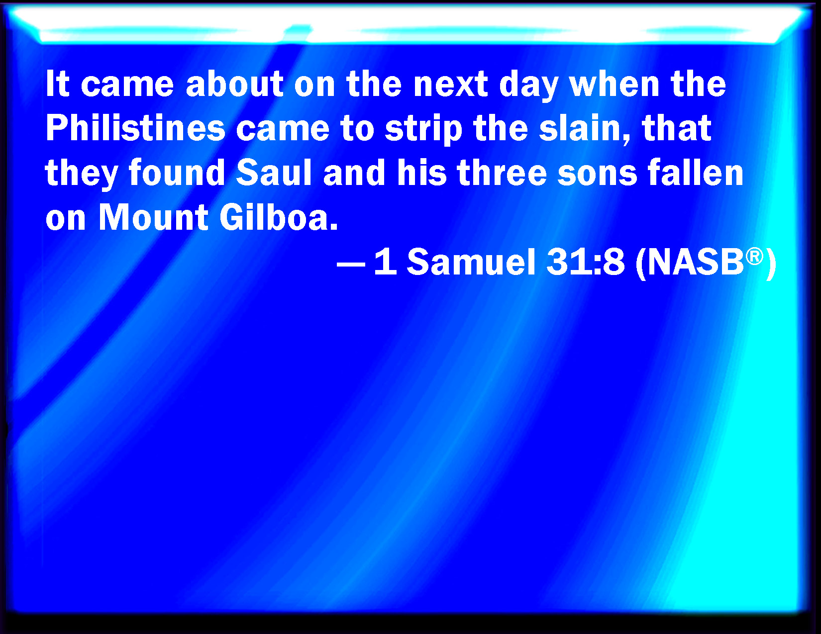 Bible Verse Slide 1 Samuel 31:8 And it came to pass on the morrow, when the Philistines came to strip the slain, that they found Saul and his three sons fallen in mount Gilboa. KJV: And it came to pass on the morrow, when the Philistines came to strip the slain, that they found Saul and his three sons fallen in mount Gilboa. DRB: And on the morrow the Philistines came to strip the slain, and they found Saul and his three sons lying in mount Gelboe. DBT: And it came to pass the next day, that the Philistines came to strip the slain, and they found Saul and his three sons fallen on mount Gilboa. ERV: And it came to pass on the morrow, when the Philistines came to strip the slain, that they found Saul and his three sons fallen in mount Gilboa. WBT: And it came to pass on the morrow, when the Philistines came to strip the slain, that they found Saul and his three sons fallen in mount Gilboa. WEB: It happened on the next day, when the Philistines came to strip the slain, that they found Saul and his three sons fallen on Mount Gilboa. YLT: And it cometh to pass on the morrow, that the Philistines come to strip the wounded, and they find Saul and his three sons fallen on mount Gilboa,Links 1 Samuel 31:8 NIV • 1 Samuel 31:8 NLT • 1 Samuel 31:8 ESV • 1 Samuel 31:8 NASB • 1 Samuel 31:8 KJV • 1 Samuel 31:8 Interlinear • 1 Samuel 31:8 Commentaries • 1 Samuel 31:8 Parallel Texts • 1 Samuel 31:8 Bible Apps • 1 Samuel 31:8 Parallel • Bible Hub |