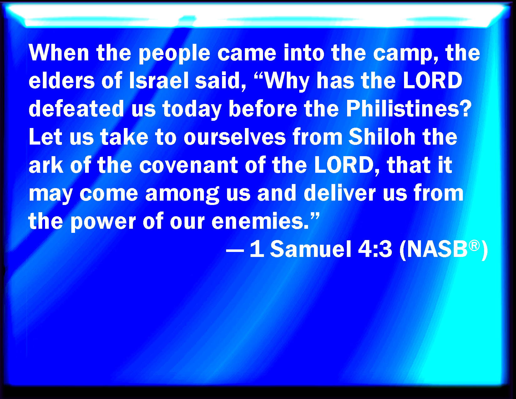 Bible Verse Slide 1 Samuel 4:3 And when the people were come into the camp, the elders of Israel said, Why has the LORD smitten us to day before the Philistines? Let us fetch the ark of the covenant of the LORD out of Shiloh to us, that, when it comes among us, it may save us out of the hand of our enemies. KJV: And when the people were come into the camp, the elders of Israel said, Wherefore hath the LORD smitten us to day before the Philistines? Let us fetch the ark of the covenant of the LORD out of Shiloh unto us, that, when it cometh among us, it may save us out of the hand of our enemies. DRB: And the people returned to the camp: and the ancients of Israel said: Why hath the Lord defeated us to day before the Philistines? Let us fetch unto us the ark of the covenant of the Lord from Silo, and let it come in the midst of us, that it may save us from the hand of our enemies. DBT: And the people came into the camp; and the elders of Israel said, Why has Jehovah smitten us to-day before the Philistines? Let us fetch ourselves the ark of the covenant of Jehovah out of Shiloh, that it may come among us, and save us out of the hand of our enemies. ERV: And when the people were come into the camp, the elders of Israel said, Wherefore hath the LORD smitten us today before the Philistines? Let as fetch the ark of the covenant of the LORD out of Shiloh unto us, that it may come among us, and save us out of the hand of our enemies. WBT: And when the people had come into the camp, the elders of Israel said, Why hath the LORD smitten us to-day before the Philistines? Let us bring the ark of the covenant of the LORD out of Shiloh to us, that when it cometh among us, it may save us from the hand of our enemies. WEB: When the people were come into the camp, the elders of Israel said, "Why has Yahweh struck us today before the Philistines? Let us get the ark of the covenant of Yahweh out of Shiloh to us, that it may come among us, and save us out of the hand of our enemies." YLT: And the people cometh in unto the camp, and the elders of Israel say, 'Why hath Jehovah smitten us to-day before the Philistines? we take unto us from Shiloh the ark of the covenant of Jehovah, and it cometh into our midst, and He doth save us out of the hand of our enemies.'Links 1 Samuel 4:3 NIV • 1 Samuel 4:3 NLT • 1 Samuel 4:3 ESV • 1 Samuel 4:3 NASB • 1 Samuel 4:3 KJV • 1 Samuel 4:3 Interlinear • 1 Samuel 4:3 Commentaries • 1 Samuel 4:3 Parallel Texts • 1 Samuel 4:3 Bible Apps • 1 Samuel 4:3 Parallel • Bible Hub |