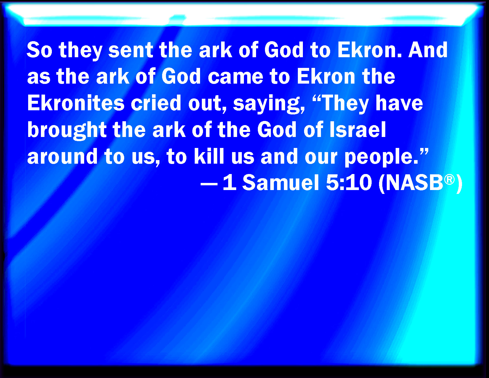 Bible Verse Slide 1 Samuel 5:10 Therefore they sent the ark of God to Ekron. And it came to pass, as the ark of God came to Ekron, that the Ekronites cried out, saying, They have brought about the ark of the God of Israel to us, to slay us and our people. KJV: Therefore they sent the ark of God to Ekron. And it came to pass, as the ark of God came to Ekron, that the Ekronites cried out, saying, They have brought about the ark of the God of Israel to us, to slay us and our people. DRB: Therefore they sent the ark of God into Accaron. And when the ark of God was come into Accaron, the Accaronites cried out, saying: They have brought the ark of the God of Israel to us, to kill us and our people. DBT: And they sent the ark of God to Ekron. And it came to pass, when the ark of God came to Ekron, that the Ekronites cried out, saying, They have brought about the ark of the God of Israel to us, to kill us and our people. ERV: So they sent the ark of God to Ekron. And it came to pass, as the ark of God came to Ekron, that the Ekronites cried out, saying, They have brought about the ark of the God of Israel to us, to slay us and our people. WBT: Therefore they sent the ark of God to Ekron. And it came to pass as the ark of God came to Ekron, that the Ekronites cried out, saying, They have brought about the ark of the God of Israel to us, to slay us and our people. WEB: So they sent the ark of God to Ekron. It happened, as the ark of God came to Ekron, that the Ekronites cried out, saying, "They have brought about the ark of the God of Israel to us, to kill us and our people." YLT: And they send the ark of God to Ekron, and it cometh to pass, at the coming in of the ark of God to Ekron, that the Ekronites cry out, saying, 'They have brought round unto us the ark of the God of Israel, to put us to death — and our people.'Links 1 Samuel 5:10 NIV • 1 Samuel 5:10 NLT • 1 Samuel 5:10 ESV • 1 Samuel 5:10 NASB • 1 Samuel 5:10 KJV • 1 Samuel 5:10 Interlinear • 1 Samuel 5:10 Commentaries • 1 Samuel 5:10 Parallel Texts • 1 Samuel 5:10 Bible Apps • 1 Samuel 5:10 Parallel • Bible Hub |