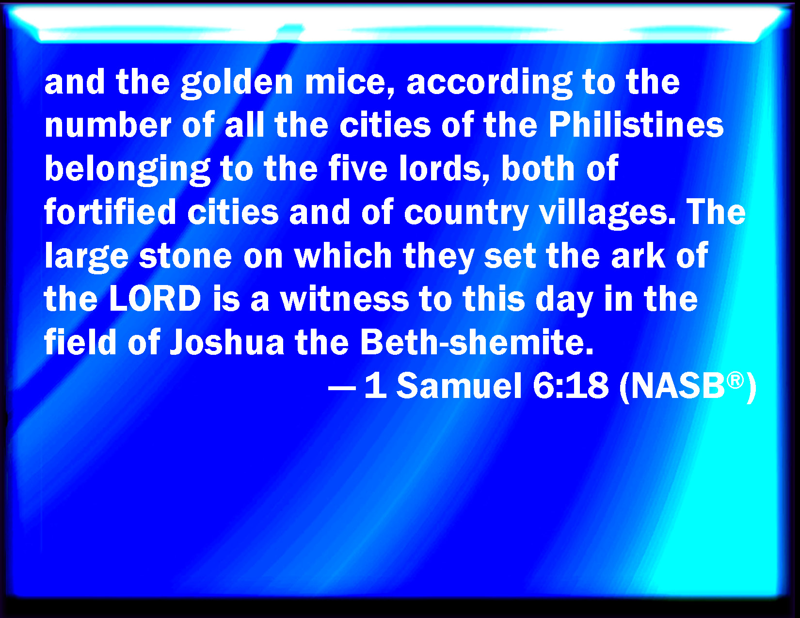 Bible Verse Slide 1 Samuel 6:18 And the golden mice, according to the number of all the cities of the Philistines belonging to the five lords, both of fenced cities, and of country villages, even to the great stone of Abel, where on they set down the ark of the LORD: which stone remains to this day in the field of Joshua, the Bethshemite. KJV: And the golden mice, according to the number of all the cities of the Philistines belonging to the five lords, both of fenced cities, and of country villages, even unto the great stone of Abel, whereon they set down the ark of the LORD: which stone remaineth unto this day in the field of Joshua, the Bethshemite. DRB: And the golden mice according to the number of the cities of the Philistines, of the five provinces, from the fenced city to the village that was without wall, and to the great Abel (the stone) whereon they set down the ark of the Lord, which was till that day in the field of Josue the Bethsamite. DBT: and the golden mice, according to the number of all the cities of the Philistines belonging to the five lords, both fortified cities and villages of the peasantry; and they brought them as far as the great stone of Abel, whereon they set down the ark of Jehovah, which is to this day in the field of Joshua the Beth-shemeshite. ERV: and the golden mice, according to the number of all the cities of the Philistines belonging to the five lords, both of fenced cities and of country villages: even unto the great stone, whereon they set down the ark of the LORD, which stone remaineth unto this day in the field of Joshua the Beth-shemite. WBT: And the golden mice, according to the number of all the cities of the Philistines belonging to the five lords, both of fortified cities, and of country villages, even to the great stone of Abel, on which they set down the ark of the LORD: which stone remaineth to this day in the field of Joshua the Beth-shemite. WEB: and the golden mice, according to the number of all the cities of the Philistines belonging to the five lords, both of fortified cities and of country villages, even to the great stone, whereon they set down the ark of Yahweh, [which stone remains] to this day in the field of Joshua of Beth Shemesh. YLT: and the golden mice — the number of all the cities of the Philistines — for the five princes, from the fenced city even unto the hamlet of the villages, even unto the great meadow on which they placed the ark of Jehovah — are unto this day in the field of Joshua the Beth-Shemeshite.Links 1 Samuel 6:18 NIV • 1 Samuel 6:18 NLT • 1 Samuel 6:18 ESV • 1 Samuel 6:18 NASB • 1 Samuel 6:18 KJV • 1 Samuel 6:18 Interlinear • 1 Samuel 6:18 Commentaries • 1 Samuel 6:18 Parallel Texts • 1 Samuel 6:18 Bible Apps • 1 Samuel 6:18 Parallel • Bible Hub |