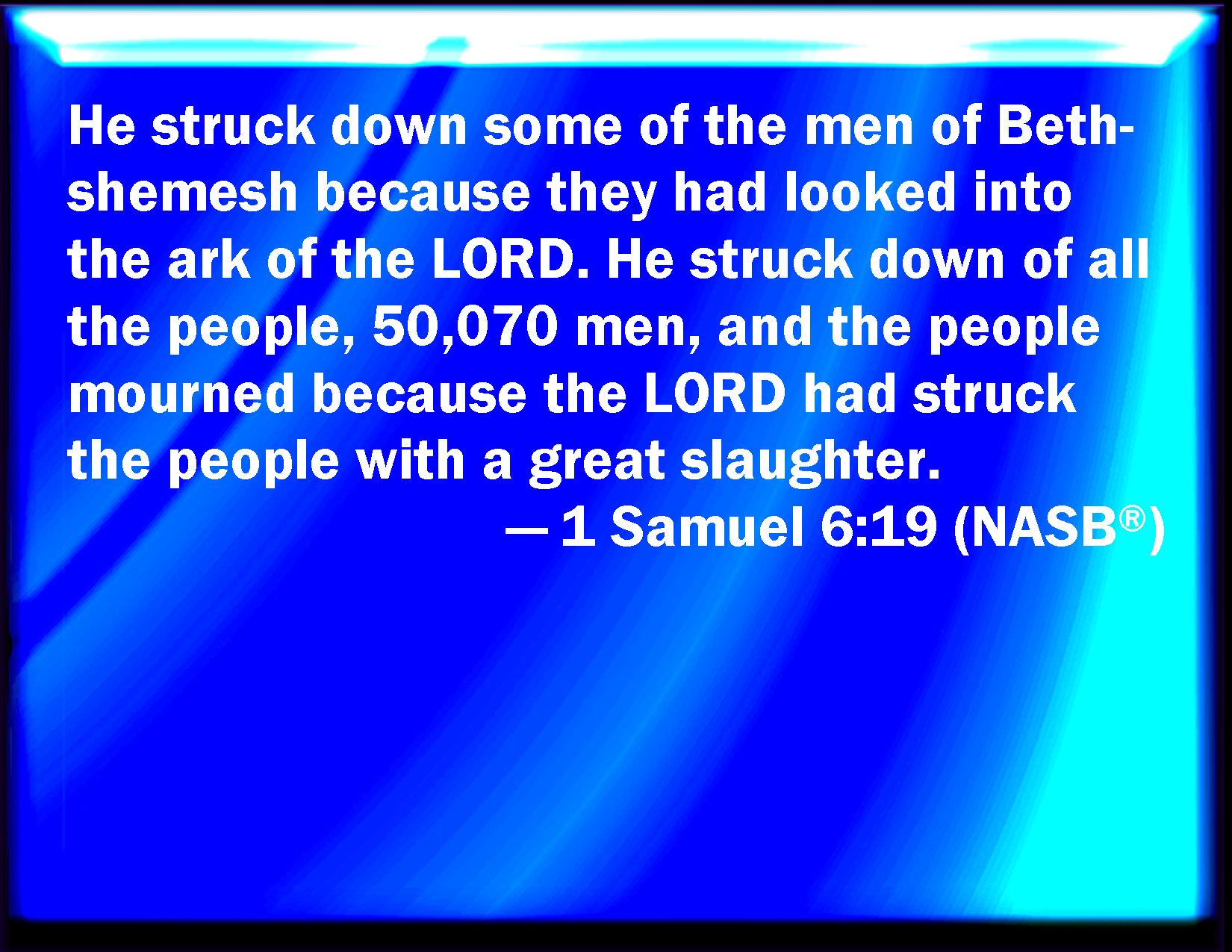 Bible Verse Slide 1 Samuel 6:19 And he smote the men of Bethshemesh, because they had looked into the ark of the LORD, even he smote of the people fifty thousand and three score and ten men: and the people lamented, because the LORD had smitten many of the people with a great slaughter. KJV: And he smote the men of Bethshemesh, because they had looked into the ark of the LORD, even he smote of the people fifty thousand and threescore and ten men: and the people lamented, because the LORD had smitten many of the people with a great slaughter. DRB: But he slew of the men of Bethsames, because they had seen the ark of the Lord: and he slew of the people seventy men, and fifty thousand of the common people. And the people lamented, because the Lord had smitten the people with a great slaughter. DBT: And he smote among the men of Beth-shemesh, because they had looked into the ark of Jehovah, and smote of the people seventy men; and the people lamented, because Jehovah had smitten the people with a great slaughter. ERV: And he smote of the men of Beth-shemesh, because they had looked into the ark of the LORD, even he smote of the people seventy men, and fifty thousand men: and the people mourned, because the LORD had smitten the people with a great slaughter. WBT: And he smote the men of Beth-shemesh, because they had looked into the ark of the LORD, even he smote of the people fifty thousand and seventy men: and the people lamented, because the LORD had smitten many of the people with a great slaughter. WEB: He struck of the men of Beth Shemesh, because they had looked into the ark of Yahweh, he struck of the people fifty thousand seventy men; and the people mourned, because Yahweh had struck the people with a great slaughter. YLT: And He smiteth among the men of Beth-Shemesh, for they looked into the ark of Jehovah, yea, He smiteth among the people seventy men — fifty chief men; and the people mourn, because Jehovah smote among the people — a great smiting.Links 1 Samuel 6:19 NIV • 1 Samuel 6:19 NLT • 1 Samuel 6:19 ESV • 1 Samuel 6:19 NASB • 1 Samuel 6:19 KJV • 1 Samuel 6:19 Interlinear • 1 Samuel 6:19 Commentaries • 1 Samuel 6:19 Parallel Texts • 1 Samuel 6:19 Bible Apps • 1 Samuel 6:19 Parallel • Bible Hub |