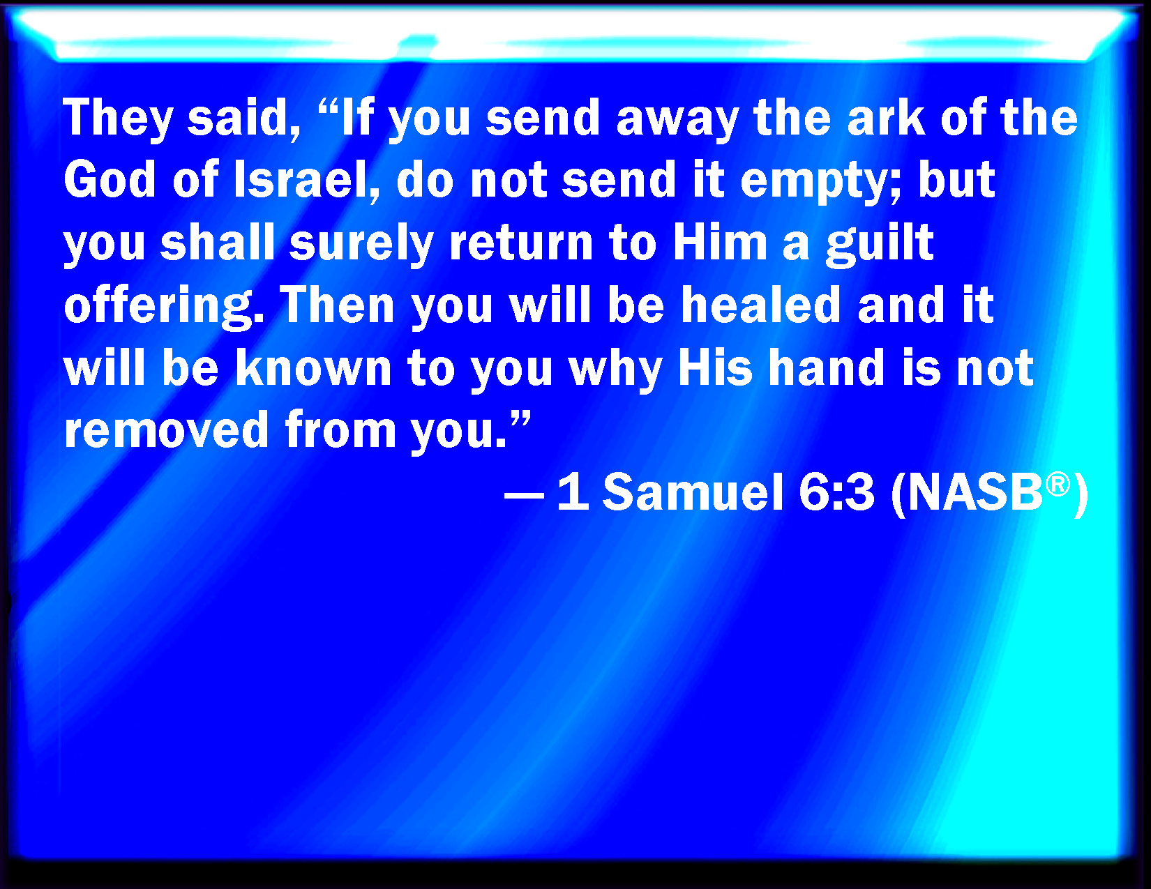 Bible Verse Slide 1 Samuel 6:3 And they said, If you send away the ark of the God of Israel, send it not empty; but in any wise return him a trespass offering: then you shall be healed, and it shall be known to you why his hand is not removed from you. KJV: And they said, If ye send away the ark of the God of Israel, send it not empty; but in any wise return him a trespass offering: then ye shall be healed, and it shall be known to you why his hand is not removed from you. DRB: If you send back the ark of the God of Israel, send it not away empty, but render unto him what you owe for sin, and then you shall be healed: and you shall know why his hand departeth not from you. DBT: And they said, If ye send away the ark of the God of Israel, send it not empty; ye must at any rate return him a trespass-offering: then ye shall be healed, and it shall be known to you why his hand is not removed from you. ERV: And they said, If ye send away the ark of the God of Israel, send it not empty; but in any wise return him a guilt offering: then ye shall be healed, and it shall be known to you why his hand is not removed from you. WBT: And they said, If ye send away the ark of the God of Israel, send it not empty; but in any wise return him a trespass-offering: then ye will be healed, and it will be known to you why his hand is not removed from you. WEB: They said, "If you send away the ark of the God of Israel, don't send it empty; but by all means return him a trespass offering: then you shall be healed, and it shall be known to you why his hand is not removed from you." YLT: And they say, 'If ye are sending away the ark of the God of Israel, ye do not send it away empty; for ye do certainly send back to Him a guilt-offering; then ye are healed, and it hath been known to you why His hand doth not turn aside from you.'Links 1 Samuel 6:3 NIV • 1 Samuel 6:3 NLT • 1 Samuel 6:3 ESV • 1 Samuel 6:3 NASB • 1 Samuel 6:3 KJV • 1 Samuel 6:3 Interlinear • 1 Samuel 6:3 Commentaries • 1 Samuel 6:3 Parallel Texts • 1 Samuel 6:3 Bible Apps • 1 Samuel 6:3 Parallel • Bible Hub |