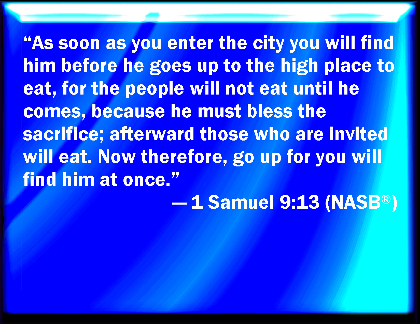 1 Samuel 9:13 As soon as you be come into the city, you shall straightway find him, before he go up to the high place to eat: for the people will not eat until he come, because he does bless the sacrifice; and afterwards they eat that be bidden. Now therefore get you up; for about this time you shall find him.
