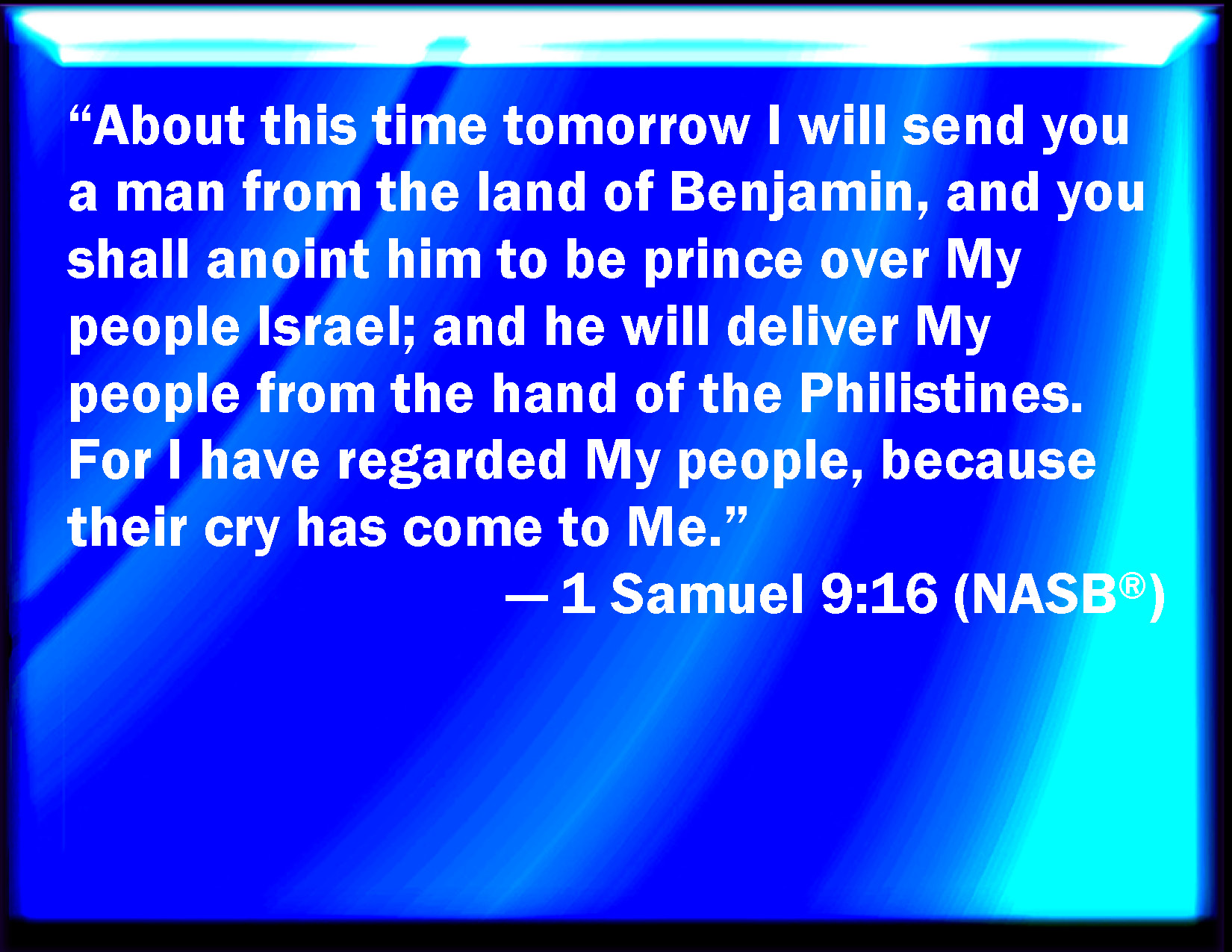 "Tomorrow about this time I will send you a man out of the land of Benjamin, and you shall anoint him to be prince over my people Israel; and he shall save my people out of the hand of the Philistines: for I have looked on my people, because their cry has come to me."