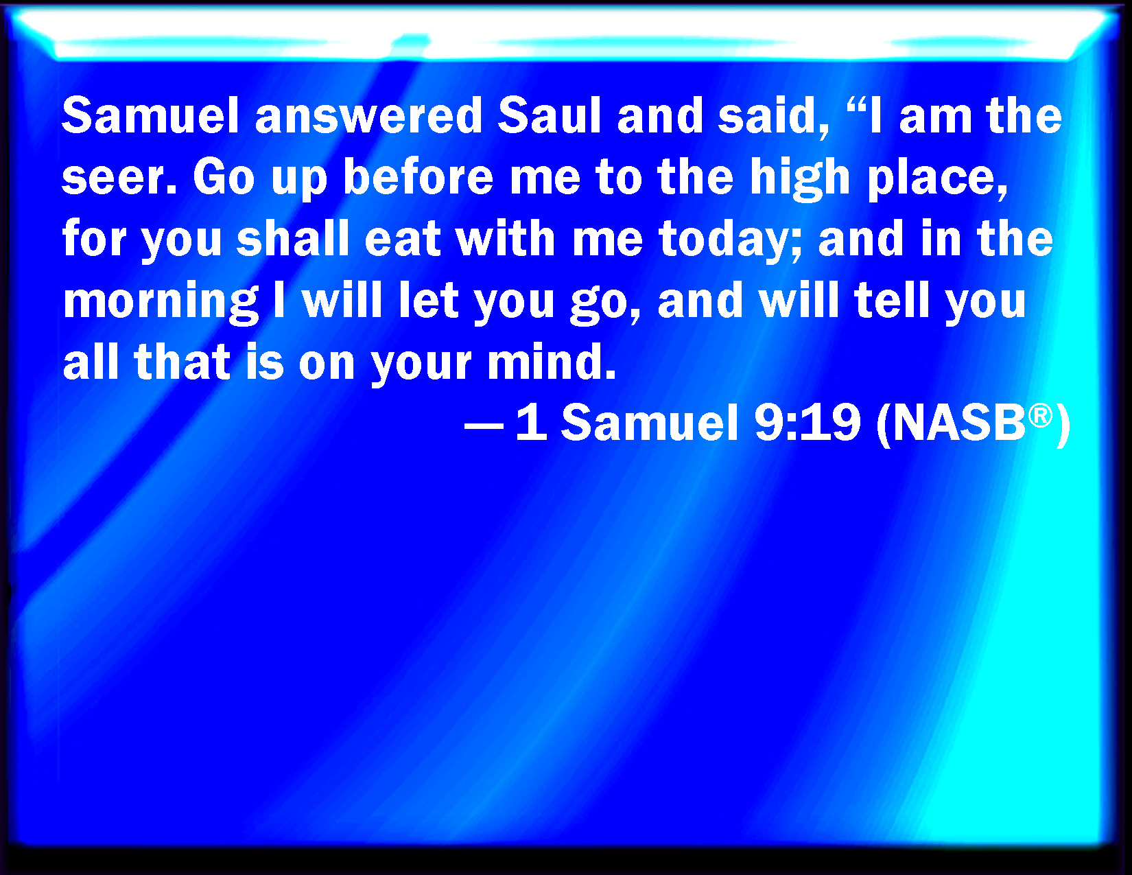 Bible Verse Slide 1 Samuel 9:19 And Samuel answered Saul, and said, I am the seer: go up before me to the high place; for you shall eat with me to day, and to morrow I will let you go, and will tell you all that is in your heart. KJV: And Samuel answered Saul, and said, I am the seer: go up before me unto the high place; for ye shall eat with me to day, and to morrow I will let thee go, and will tell thee all that is in thine heart. DRB: And Samuel answered Saul, saying: I am the seer, go up before me to the high place, that you may eat with me to day, and I will let thee go in the morning: and tell thee all that is in thy heart. DBT: And Samuel answered Saul and said, I am the seer: go up before me to the high place, and ye shall eat with me to-day; and to-morrow I will let thee go, and will tell thee all that is in thy heart. ERV: And Samuel answered Saul, and said, I am the seer; go up before me unto the high place, for ye shall eat with me today: and in the morning I will let thee go, and will tell thee all that is in thine heart. WBT: And Samuel answered Saul, and said, I am the seer: go up before me to the high place; for ye shall eat with me to-day, and to-morrow I will let thee go, and will tell thee all that is in thy heart. WEB: Samuel answered Saul, and said, "I am the seer. Go up before me to the high place, for you shall eat with me today. In the morning I will let you go, and will tell you all that is in your heart. YLT: And Samuel answereth Saul and saith, 'I am the seer; go up before me into the high place, and ye have eaten with me to-day, and I have sent thee away in the morning, and all that is in thy heart I declare to thee.Links 1 Samuel 9:19 NIV • 1 Samuel 9:19 NLT • 1 Samuel 9:19 ESV • 1 Samuel 9:19 NASB • 1 Samuel 9:19 KJV • 1 Samuel 9:19 Interlinear • 1 Samuel 9:19 Commentaries • 1 Samuel 9:19 Parallel Texts • 1 Samuel 9:19 Bible Apps • 1 Samuel 9:19 Parallel • Bible Hub |