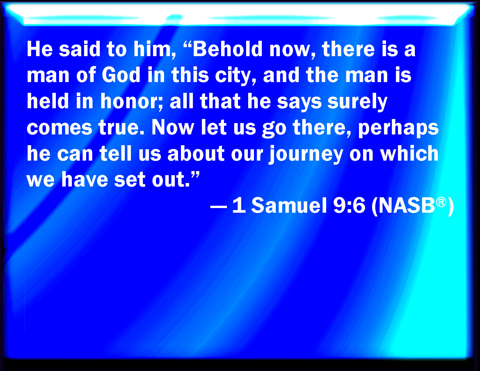 Bible Verse Slide 1 Samuel 9:6 And he said to him, Behold now, there is in this city a man of God, and he is an honorable man; all that he said comes surely to pass: now let us go thither; peradventure he can show us our way that we should go. KJV: And he said unto him, Behold now, there is in this city a man of God, and he is an honourable man; all that he saith cometh surely to pass: now let us go thither; peradventure he can shew us our way that we should go. DRB: And he said to him: Behold there is a man of God in this city, a famous man: all that he saith, cometh certainly to pass. Now therefore let us go thither, perhaps he may tell us of our way, for which we are come. DBT: And he said to him, Behold now, a man of God is in this city, and the man is held in honour; all that he says comes surely to pass. Let us now go thither: perhaps he will shew us the way that we should go. ERV: And he said unto him, Behold now, there is in this city a man of God, and he is a man that is held in honour; all that he saith cometh surely to pass: now let us go thither; peradventure he can tell us concerning our journey whereon we go. WBT: And he said to him, Behold now, there is in this city a man of God, and he is an honorable man; all that he saith cometh surely to pass: now let us go thither; it may be he can show us our way that we should go. WEB: He said to him, "See now, there is in this city a man of God, and he is a man who is held in honor. All that he says comes surely to pass. Now let us go there. Perhaps he can tell us concerning our journey whereon we go." YLT: And he saith to him, 'Lo, I pray thee, a man of God is in this city, and the man is honoured; all that he speaketh doth certainly come; now, we go there, it may be he doth declare to us our way on which we have gone.'Links 1 Samuel 9:6 NIV • 1 Samuel 9:6 NLT • 1 Samuel 9:6 ESV • 1 Samuel 9:6 NASB • 1 Samuel 9:6 KJV • 1 Samuel 9:6 Interlinear • 1 Samuel 9:6 Commentaries • 1 Samuel 9:6 Parallel Texts • 1 Samuel 9:6 Bible Apps • 1 Samuel 9:6 Parallel • Bible Hub |