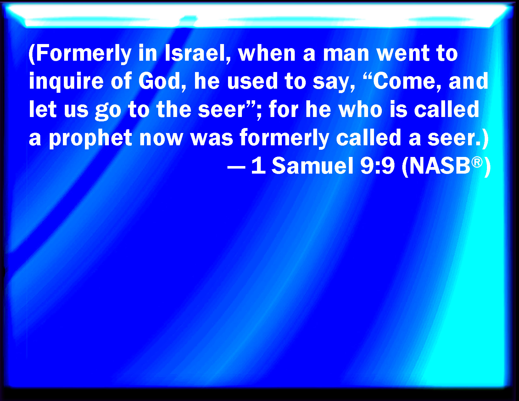 Bible Verse Slide 1 Samuel 9:9 (Beforetime in Israel, when a man went to inquire of God, thus he spoke, Come, and let us go to the seer: for he that is now called a Prophet was beforetime called a Seer.) KJV: (Beforetime in Israel, when a man went to inquire of God, thus he spake, Come, and let us go to the seer: for he that is now called a Prophet was beforetime called a Seer.) DRB: Now in time past, in Israel when a man went to consult God he spoke thus: Come, let us go to the seer. For he that is now called a prophet, in time past was called a seer. DBT: (In former time in Israel, when a man went to ask counsel of God, he said, Come and let us go to the seer; for he that is now called a Prophet was in former time called a Seer.) ERV: (Beforetime in Israel, when a man went to inquire of God, thus he said, Come and let us go to the seer: for he that is now called a Prophet was beforetime called a Seer.) WBT: (Formerly in Israel, when a man went to inquire of God, thus he spoke, Come, and let us go to the seer: for he that is now called a Prophet was formerly called a Seer.) WEB: (In earlier times in Israel, when a man went to inquire of God, thus he said, "Come, and let us go to the seer;" for he who is now called a prophet was before called a Seer.) YLT: Formerly in Israel, thus said the man in his going to seek God, 'Come and we go unto the seer,' for the 'prophet' of to-day is called formerly 'the seer.'Links 1 Samuel 9:9 NIV • 1 Samuel 9:9 NLT • 1 Samuel 9:9 ESV • 1 Samuel 9:9 NASB • 1 Samuel 9:9 KJV • 1 Samuel 9:9 Interlinear • 1 Samuel 9:9 Commentaries • 1 Samuel 9:9 Parallel Texts • 1 Samuel 9:9 Bible Apps • 1 Samuel 9:9 Parallel • Bible Hub |