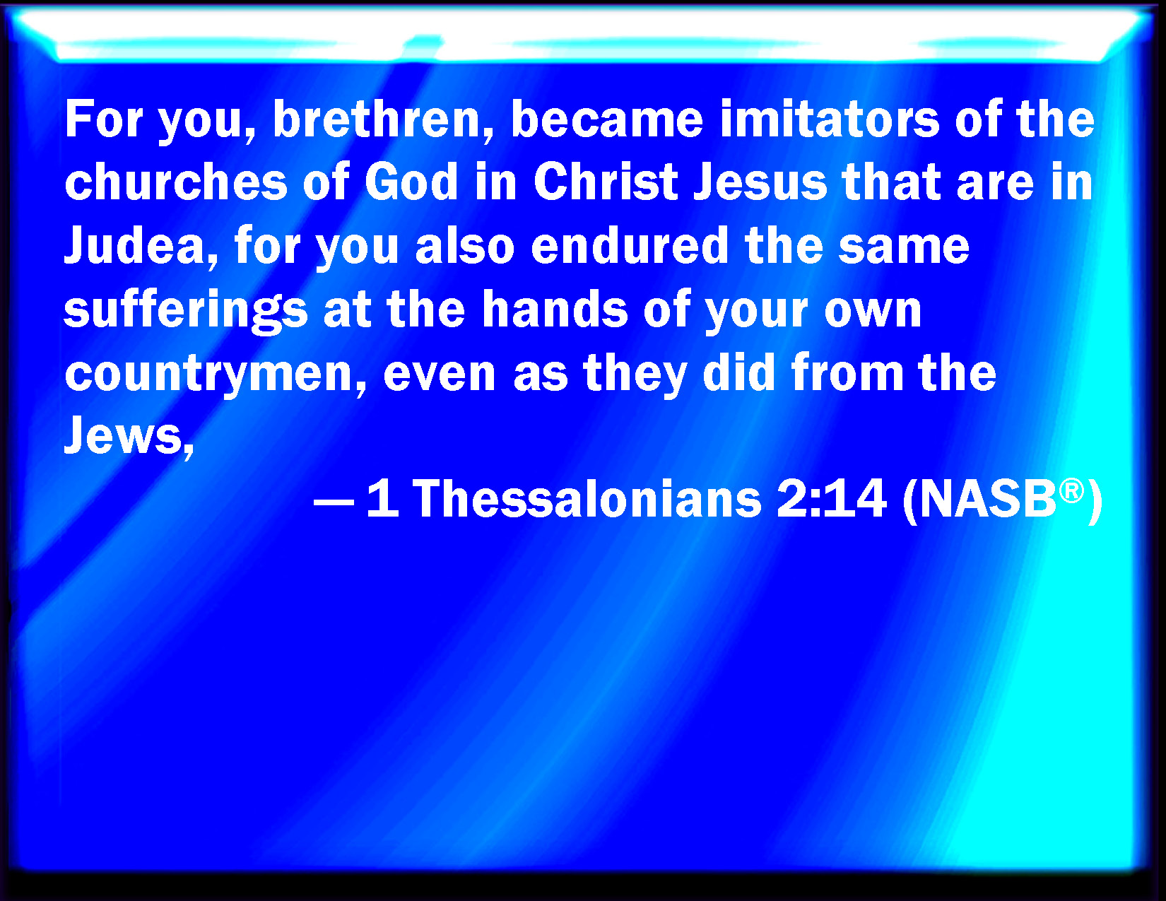Bible Verse Slide 1 Thessalonians 2:14 For you, brothers, became followers of the churches of God which in Judaea are in Christ Jesus: for you also have suffered like things of your own countrymen, even as they have of the Jews: KJV: For ye, brethren, became followers of the churches of God which in Judaea are in Christ Jesus: for ye also have suffered like things of your own countrymen, even as they have of the Jews: DRB: For you, brethren, are become followers of the churches of God which are in Judea, in Christ Jesus: for you also have suffered the same things from your own coutrymen, even as they have from the Jews, DBT: For ye, brethren, have become imitators of the assemblies of God which are in Judaea in Christ Jesus; for ye also have suffered the same things of your own countrymen as also they of the Jews, ERV: For ye, brethren, became imitators of the churches of God which are in Judaea in Christ Jesus: for ye also suffered the same things of your own countrymen, even as they did of the Jews; WBT: For ye, brethren, became followers of the churches of God which in Judea are in Christ Jesus: for ye also have suffered like things from your own countrymen, even as they have from the Jews: WEB: For you, brothers, became imitators of the assemblies of God which are in Judea in Christ Jesus; for you also suffered the same things from your own countrymen, even as they did from the Jews; YLT: for ye became imitators, brethren, of the assemblies of God that are in Judea in Christ Jesus, because such things ye suffered, even ye, from your own countrymen, as also they from the Jews,Links 1 Thessalonians 2:14 NIV • 1 Thessalonians 2:14 NLT • 1 Thessalonians 2:14 ESV • 1 Thessalonians 2:14 NASB • 1 Thessalonians 2:14 KJV • 1 Thessalonians 2:14 Interlinear • 1 Thessalonians 2:14 Commentaries • 1 Thessalonians 2:14 Parallel Texts • 1 Thessalonians 2:14 Bible Apps • 1 Thessalonians 2:14 Parallel • Bible Hub |