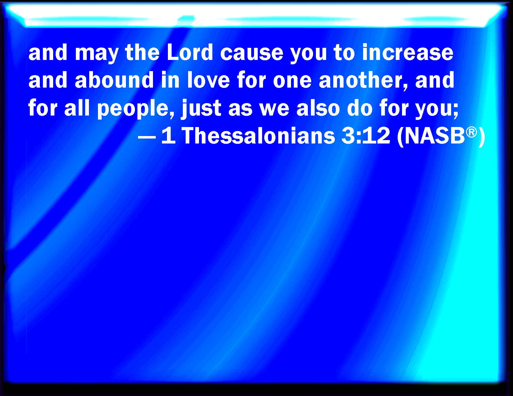 Bible Verse Slide 1 Thessalonians 3:12 And the Lord make you to increase and abound in love one toward another, and toward all men, even as we do toward you: KJV: And the Lord make you to increase and abound in love one toward another, and toward all men, even as we do toward you: DRB: And may the Lord multiply you, and make you abound in charity towards one another, and towards all men: as we do also towards you, DBT: But you, may the Lord make to exceed and abound in love toward one another, and toward all, even as we also towards you, ERV: and the Lord make you to increase and abound in love one toward another, and toward all men, even as we also do toward you; WBT: And the Lord make you to increase and abound in love one towards another, and towards all men, even as we do towards you: WEB: and the Lord make you to increase and abound in love one toward another, and toward all men, even as we also do toward you, YLT: and you the Lord cause to increase and to abound in the love to one another, and to all, even as we also to you,Links 1 Thessalonians 3:12 NIV • 1 Thessalonians 3:12 NLT • 1 Thessalonians 3:12 ESV • 1 Thessalonians 3:12 NASB • 1 Thessalonians 3:12 KJV • 1 Thessalonians 3:12 Interlinear • 1 Thessalonians 3:12 Commentaries • 1 Thessalonians 3:12 Parallel Texts • 1 Thessalonians 3:12 Bible Apps • 1 Thessalonians 3:12 Parallel • Bible Hub |