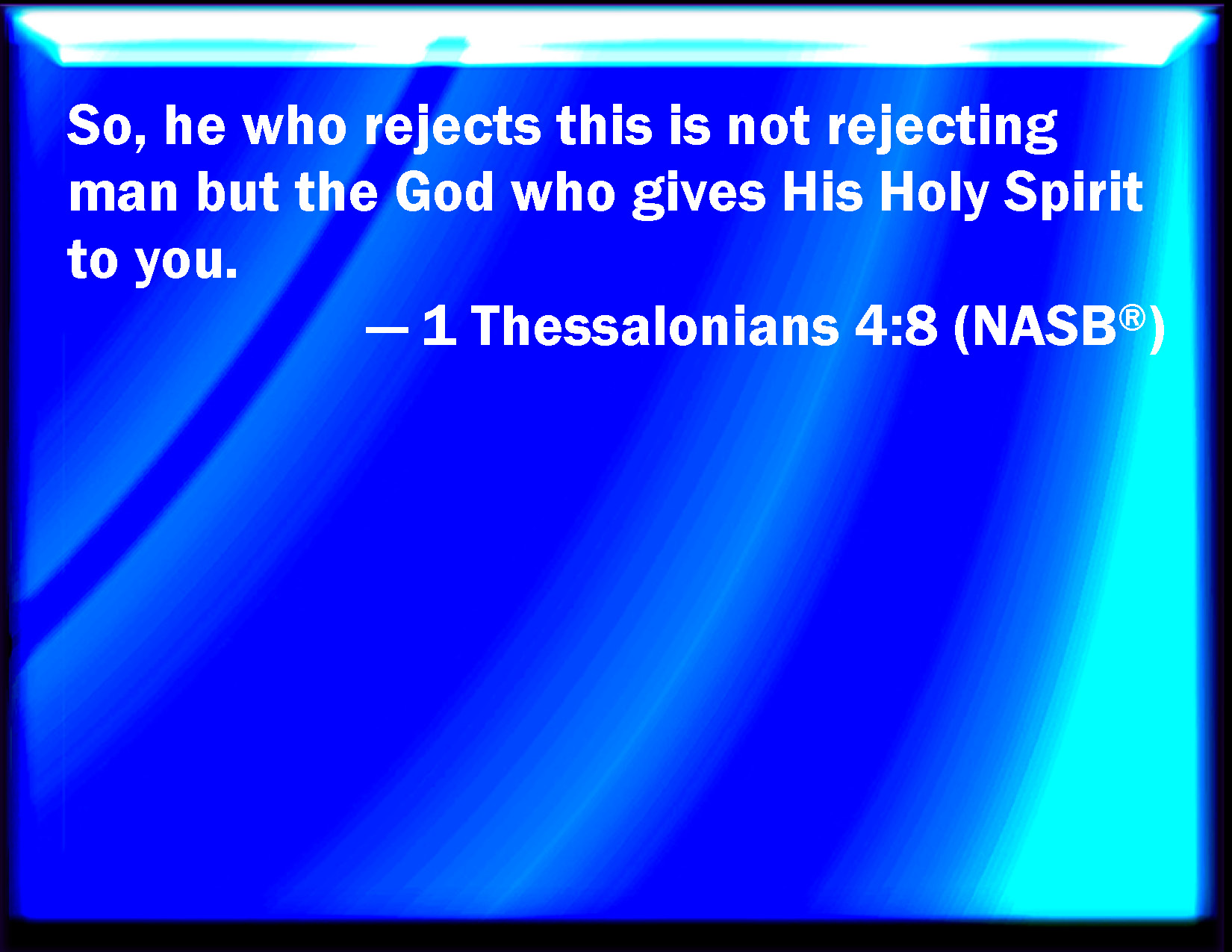 Bible Verse Slide 1 Thessalonians 4:8 He therefore that despises, despises not man, but God, who has also given to us his holy Spirit. KJV: He therefore that despiseth, despiseth not man, but God, who hath also given unto us his holy Spirit. DRB: Therefore, he that despiseth these things, despiseth not man, but God, who also hath given his holy Spirit in us. DBT: He therefore that in this disregards his brother, disregards, not man, but God, who has given also his Holy Spirit to you. ERV: Therefore he that rejecteth, rejecteth not man, but God, who giveth his Holy Spirit unto you. WBT: He therefore that despiseth, despiseth not man, but God, who hath also given to us his holy Spirit. WEB: Therefore he who rejects this doesn't reject man, but God, who has also given his Holy Spirit to you. YLT: he, therefore, who is despising — doth not despise man, but God, who also did give His Holy Spirit to us.Links 1 Thessalonians 4:8 NIV • 1 Thessalonians 4:8 NLT • 1 Thessalonians 4:8 ESV • 1 Thessalonians 4:8 NASB • 1 Thessalonians 4:8 KJV • 1 Thessalonians 4:8 Interlinear • 1 Thessalonians 4:8 Commentaries • 1 Thessalonians 4:8 Parallel Texts • 1 Thessalonians 4:8 Bible Apps • 1 Thessalonians 4:8 Parallel • Bible Hub |
