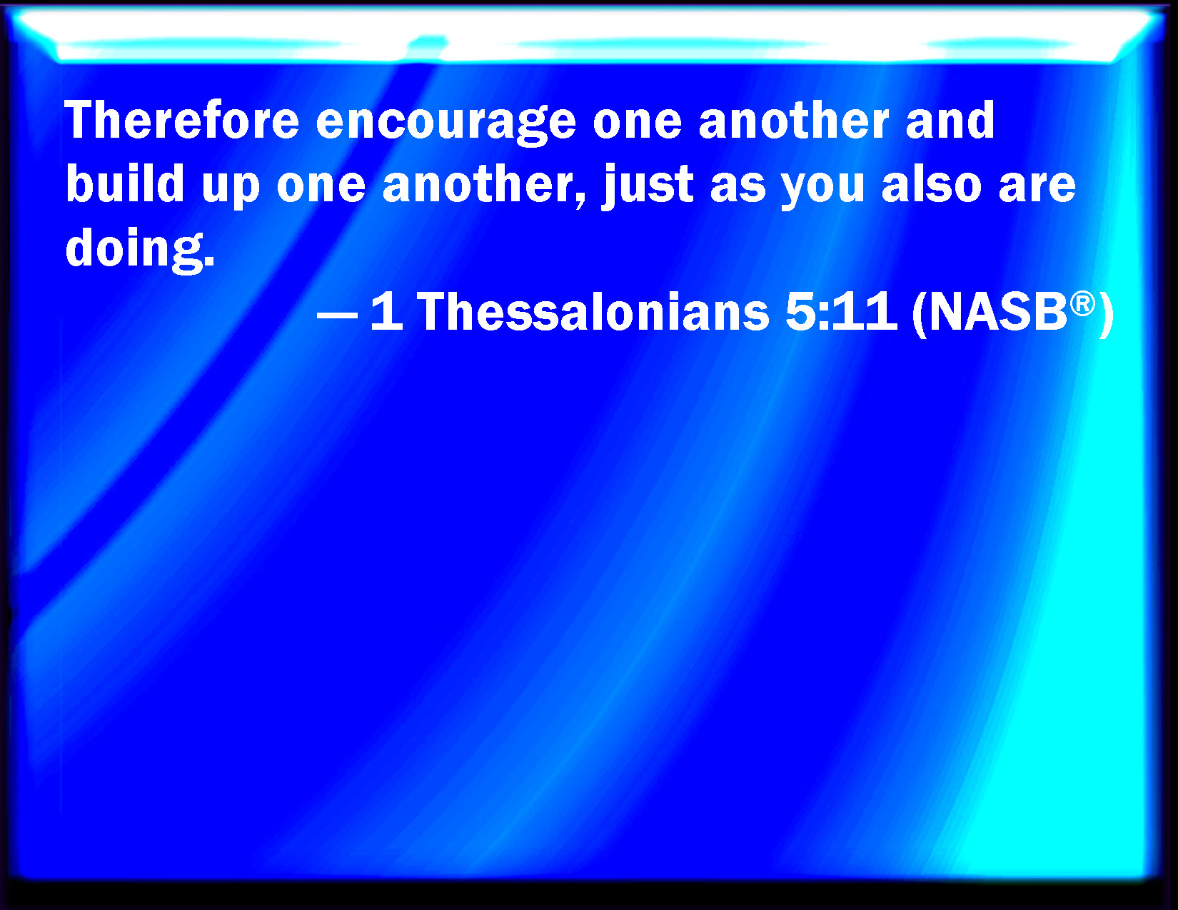 Bible Verse Slide 1 Thessalonians 5:11 Why comfort yourselves together, and edify one another, even as also you do. KJV: Wherefore comfort yourselves together, and edify one another, even as also ye do. DRB: For which cause comfort one another; and edify one another, as you also do. DBT: Wherefore encourage one another, and build up each one the other, even as also ye do. ERV: Wherefore exhort one another, and build each other up, even as also ye do. WBT: Wherefore, comfort yourselves together, and edify one another, even as also ye do. WEB: Therefore exhort one another, and build each other up, even as you also do. YLT: wherefore, comfort ye one another, and build ye up, one the one, as also ye do.Links 1 Thessalonians 5:11 NIV • 1 Thessalonians 5:11 NLT • 1 Thessalonians 5:11 ESV • 1 Thessalonians 5:11 NASB • 1 Thessalonians 5:11 KJV • 1 Thessalonians 5:11 Interlinear • 1 Thessalonians 5:11 Commentaries • 1 Thessalonians 5:11 Parallel Texts • 1 Thessalonians 5:11 Bible Apps • 1 Thessalonians 5:11 Parallel • Bible Hub |