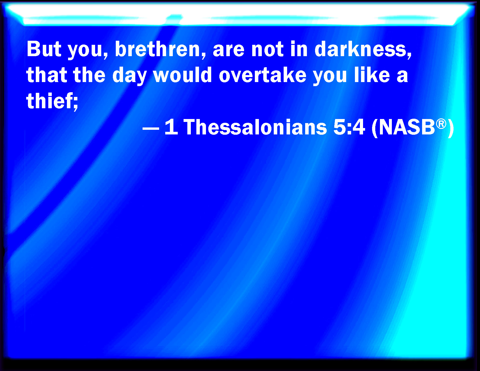 Bible Verse Slide 1 Thessalonians 5:4 But you, brothers, are not in darkness, that that day should overtake you as a thief. KJV: But ye, brethren, are not in darkness, that that day should overtake you as a thief. DRB: But you, brethren, are not in darkness, that that day should overtake you as a thief. DBT: But ye, brethren, are not in darkness, that the day should overtake you as a thief: ERV: But ye, brethren, are not in darkness, that that day should overtake you as a thief: WBT: But ye, brethren, are not in darkness, that that day should overtake you as a thief. WEB: But you, brothers, aren't in darkness, that the day should overtake you like a thief. YLT: and ye, brethren, are not in darkness, that the day may catch you as a thief;Links 1 Thessalonians 5:4 NIV • 1 Thessalonians 5:4 NLT • 1 Thessalonians 5:4 ESV • 1 Thessalonians 5:4 NASB • 1 Thessalonians 5:4 KJV • 1 Thessalonians 5:4 Interlinear • 1 Thessalonians 5:4 Commentaries • 1 Thessalonians 5:4 Parallel Texts • 1 Thessalonians 5:4 Bible Apps • 1 Thessalonians 5:4 Parallel • Bible Hub |
