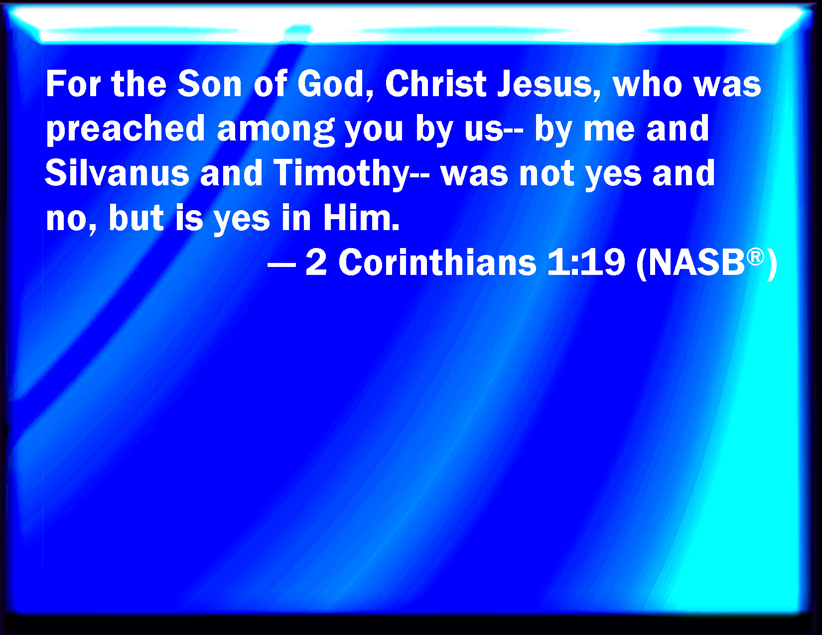 Bible Verse Slide 2 Corinthians 1:19 For the Son of God, Jesus Christ, who was preached among you by us, even by me and Silvanus and Timotheus, was not yes and no, but in him was yes. KJV: For the Son of God, Jesus Christ, who was preached among you by us, even by me and Silvanus and Timotheus, was not yea and nay, but in him was yea. DRB: For the Son of God, Jesus Christ who was preached among you by us, by me, and Sylvanus, and Timothy, was not, It is and It is not, but, It is, was in him. DBT: For the Son of God, Jesus Christ, he who has been preached by us among you (by me and Silvanus and Timotheus), did not become yea and nay, but yea is in him. ERV: For the Son of God, Jesus Christ, who was preached among you by us, even by me and Silvanus and Timothy, was not yea and nay, but in him is yea. WBT: For the Son of God, Jesus Christ, who was preached among you by us, even by me, and Silvanus, and Timothy, was not yea and nay, but in him was yea. WEB: For the Son of God, Jesus Christ, who was preached among you by us, by me, Silvanus, and Timothy, was not "Yes and no," but in him is "Yes." YLT: for the Son of God, Jesus Christ, among you through us having been preached — through me and Silvanus and Timotheus — did not become Yes and No, but in him it hath become Yes;Links 2 Corinthians 1:19 NIV • 2 Corinthians 1:19 NLT • 2 Corinthians 1:19 ESV • 2 Corinthians 1:19 NASB • 2 Corinthians 1:19 KJV • 2 Corinthians 1:19 Interlinear • 2 Corinthians 1:19 Commentaries • 2 Corinthians 1:19 Parallel Texts • 2 Corinthians 1:19 Bible Apps • 2 Corinthians 1:19 Parallel • Bible Hub |