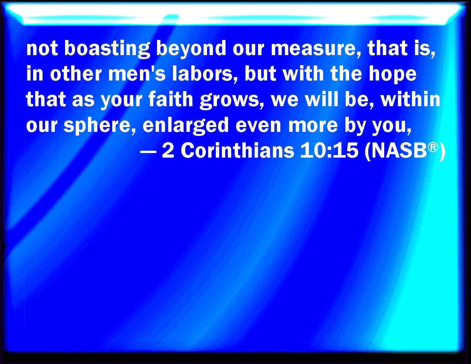 Bible Verse Slide 2 Corinthians 10:15 Not boasting of things without our measure, that is, of other men's labors; but having hope, when your faith is increased, that we shall be enlarged by you according to our rule abundantly, KJV: Not boasting of things without our measure, that is, of other men's labours; but having hope, when your faith is increased, that we shall be enlarged by you according to our rule abundantly, DRB: Not glorying beyond measure in other men's labours; but having hope of your increasing faith, to be magnified in you according to our rule abundantly; DBT: not boasting out of measure in other people's labours, but having hope, your faith increasing, to be enlarged amongst you, according to our rule, yet more abundantly ERV: not glorying beyond our measure, that is, in other men's labours; but having hope that, as your faith groweth, we shall be magnified in you according to our province unto further abundance, WBT: Not boasting of things without our measure, that is, of other men's labors; but having hope, when your faith is increased, that we shall be enlarged by you, according to our rule abundantly, WEB: not boasting beyond proper limits in other men's labors, but having hope that as your faith grows, we will be abundantly enlarged by you in our sphere of influence, YLT: not boasting of the things not measured, in other men's labours, and having hope — your faith increasing — in you to be enlarged, according to our line — into abundance,Links 2 Corinthians 10:15 NIV • 2 Corinthians 10:15 NLT • 2 Corinthians 10:15 ESV • 2 Corinthians 10:15 NASB • 2 Corinthians 10:15 KJV • 2 Corinthians 10:15 Interlinear • 2 Corinthians 10:15 Commentaries • 2 Corinthians 10:15 Parallel Texts • 2 Corinthians 10:15 Bible Apps • 2 Corinthians 10:15 Parallel • Bible Hub |