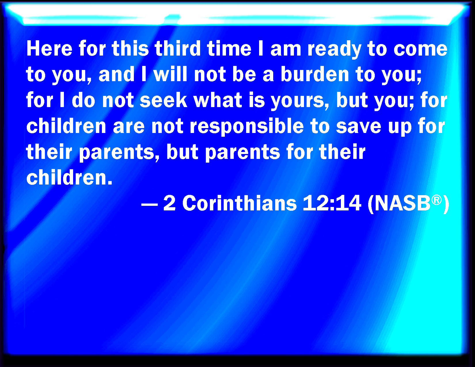 Bible Verse Slide 2 Corinthians 12:14 Behold, the third time I am ready to come to you; and I will not be burdensome to you: for I seek not yours but you: for the children ought not to lay up for the parents, but the parents for the children. KJV: Behold, the third time I am ready to come to you; and I will not be burdensome to you: for I seek not yours, but you: for the children ought not to lay up for the parents, but the parents for the children. DRB: Behold now the third time I am ready to come to you; and I will not be burthensome unto you. For I seek not the things that are yours, but you. For neither ought the children to lay up for the parents, but the parents for the children. DBT: Behold, this third time I am ready to come to you, and I will not be in laziness a charge; for I do not seek yours, but you; for the children ought not to lay up for the parents, but the parents for the children. ERV: Behold, this is the third time I am ready to come to you; and I will not be a burden to you: for I seek not yours, but you: for the children ought not to lay up for the parents, but the parents for the children. WBT: Behold, the third time I am ready to come to you; and I will not be burdensome to you: for I seek not yours, but you. For the children ought not to lay up for the parents, but the parents for the children. WEB: Behold, this is the third time I am ready to come to you, and I will not be a burden to you; for I seek not your possessions, but you. For the children ought not to save up for the parents, but the parents for the children. YLT: Lo, a third time I am ready to come unto you, and I will not be a burden to you, for I seek not yours, but you, for the children ought not for the parents to lay up, but the parents for the children,Links 2 Corinthians 12:14 NIV • 2 Corinthians 12:14 NLT • 2 Corinthians 12:14 ESV • 2 Corinthians 12:14 NASB • 2 Corinthians 12:14 KJV • 2 Corinthians 12:14 Interlinear • 2 Corinthians 12:14 Commentaries • 2 Corinthians 12:14 Parallel Texts • 2 Corinthians 12:14 Bible Apps • 2 Corinthians 12:14 Parallel • Bible Hub |