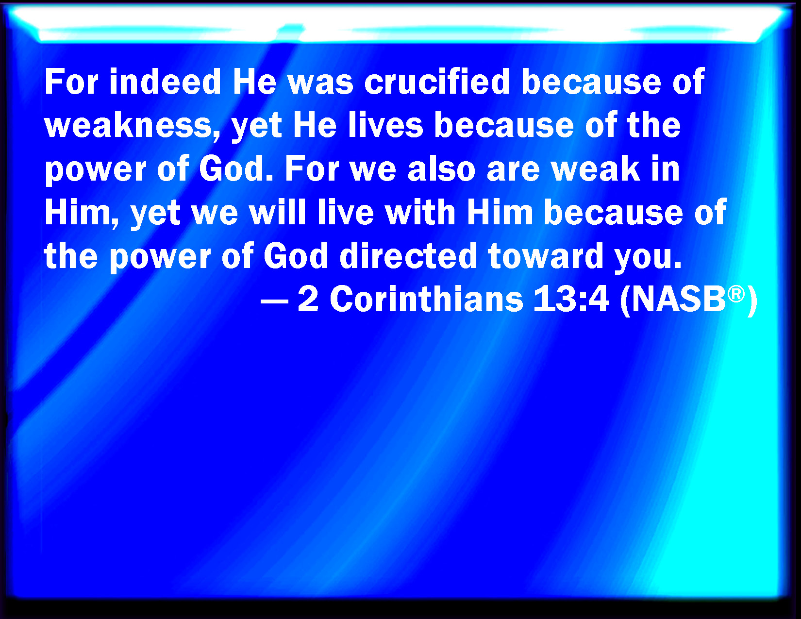 Bible Verse Slide 2 Corinthians 13:4 For though he was crucified through weakness, yet he lives by the power of God. For we also are weak in him, but we shall live with him by the power of God toward you. KJV: For though he was crucified through weakness, yet he liveth by the power of God. For we also are weak in him, but we shall live with him by the power of God toward you. DRB: For although he was crucified through weakness, yet he liveth by the power of God. For we also are weak in him: but we shall live with him by the power of God towards you. DBT: for if indeed he has been crucified in weakness, yet he lives by God's power; for indeed we are weak in him, but we shall live with him by God's power towards you,) ERV: for he was crucified through weakness, yet he liveth through the power of God. For we also are weak in him, but we shall live with him through the power of God toward you. WBT: For though he was crucified through weakness, yet he liveth by the power of God. For we also are weak in him, but we shall live with him by the power of God towards you. WEB: For he was crucified through weakness, yet he lives through the power of God. For we also are weak in him, but we will live with him through the power of God toward you. YLT: for even if he was crucified from infirmity, yet he doth live from the power of God; for we also are weak in him, but we shall live with him from the power of God toward you.Links 2 Corinthians 13:4 NIV • 2 Corinthians 13:4 NLT • 2 Corinthians 13:4 ESV • 2 Corinthians 13:4 NASB • 2 Corinthians 13:4 KJV • 2 Corinthians 13:4 Interlinear • 2 Corinthians 13:4 Commentaries • 2 Corinthians 13:4 Parallel Texts • 2 Corinthians 13:4 Bible Apps • 2 Corinthians 13:4 Parallel • Bible Hub |