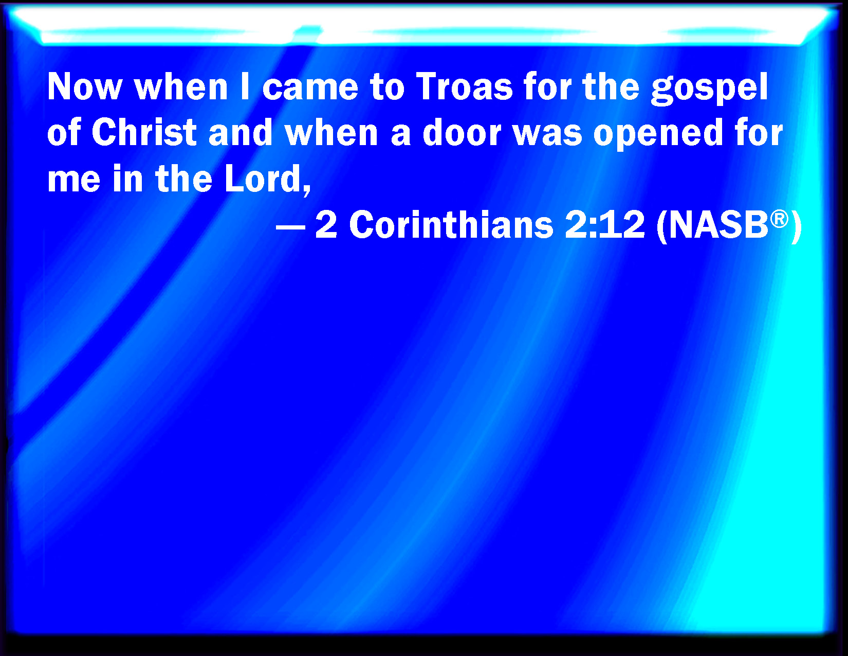 Bible Verse Slide 2 Corinthians 2:12 Furthermore, when I came to Troas to preach Christ's gospel, and a door was opened to me of the Lord, KJV: Furthermore, when I came to Troas to preach Christ's gospel, and a door was opened unto me of the Lord, DRB: And when I was come to Troas for the gospel of Christ, and a door was opened unto me in the Lord, DBT: Now when I came to Troas for the publication of the glad tidings of the Christ, a door also being opened to me in the Lord, ERV: Now when I came to Troas for the gospel of Christ, and when a door was opened unto me in the Lord, WBT: Furthermore, when I came to Troas to preach the gospel of Christ, and a door was opened to me by the Lord, WEB: Now when I came to Troas for the Good News of Christ, and when a door was opened to me in the Lord, YLT: And having come to Troas for the good news of the Christ, and a door to me having been opened in the Lord,Links 2 Corinthians 2:12 NIV • 2 Corinthians 2:12 NLT • 2 Corinthians 2:12 ESV • 2 Corinthians 2:12 NASB • 2 Corinthians 2:12 KJV • 2 Corinthians 2:12 Interlinear • 2 Corinthians 2:12 Commentaries • 2 Corinthians 2:12 Parallel Texts • 2 Corinthians 2:12 Bible Apps • 2 Corinthians 2:12 Parallel • Bible Hub |