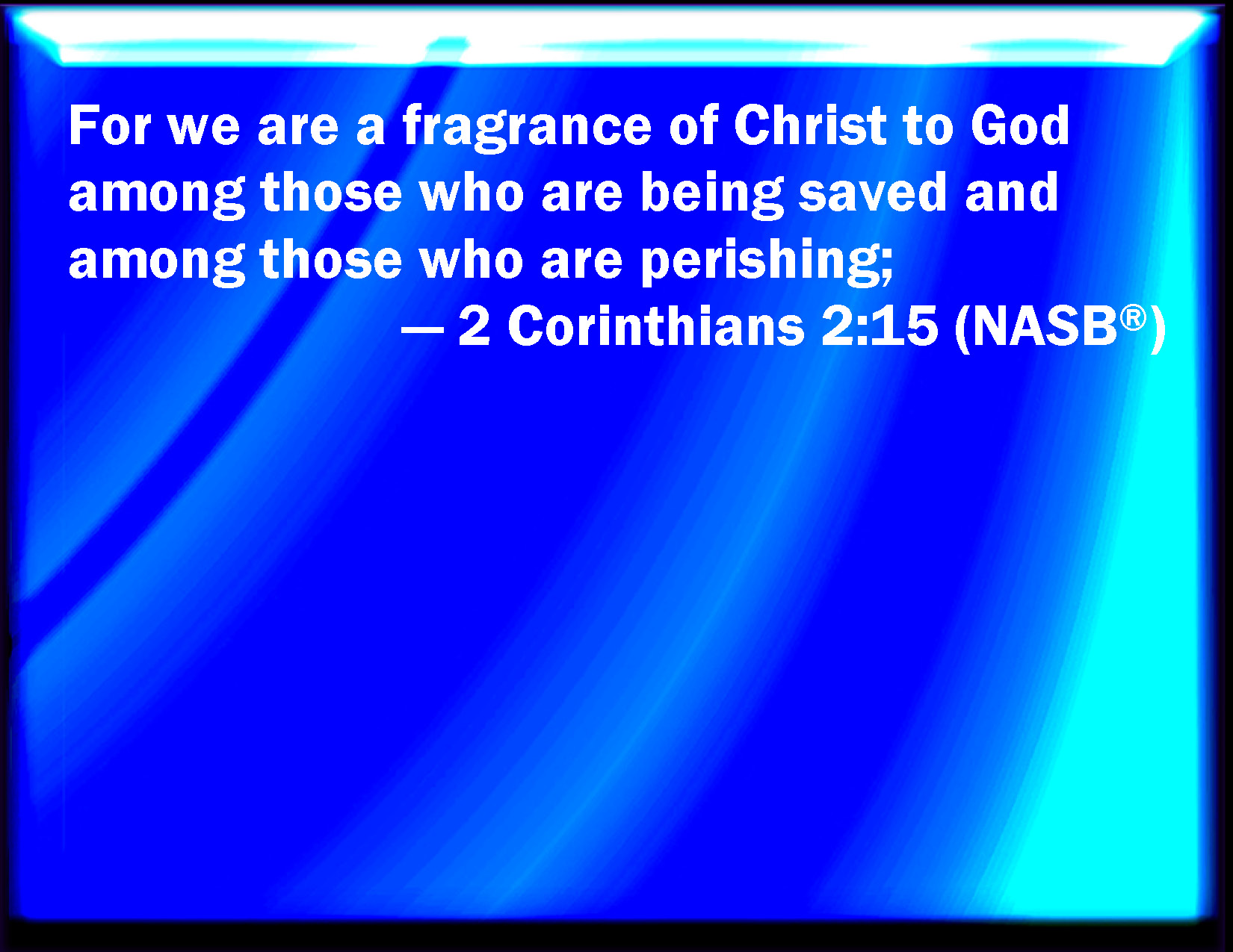 Bible Verse Slide 2 Corinthians 2:15 For we are to God a sweet smell of Christ, in them that are saved, and in them that perish: KJV: For we are unto God a sweet savour of Christ, in them that are saved, and in them that perish: DRB: For we are the good odour of Christ unto God, in them that are saved, and in them that perish. DBT: For we are a sweet odour of Christ to God, in the saved and in those that perish: ERV: For we are a sweet savour of Christ unto God, in them that are being saved, and in them that are perishing; WBT: For we are to God a sweet savor of Christ, in them that are saved, and in them that perish: WEB: For we are a sweet aroma of Christ to God, in those who are saved, and in those who perish; YLT: because of Christ a sweet fragrance we are to God, in those being saved, and in those being lost;Links 2 Corinthians 2:15 NIV • 2 Corinthians 2:15 NLT • 2 Corinthians 2:15 ESV • 2 Corinthians 2:15 NASB • 2 Corinthians 2:15 KJV • 2 Corinthians 2:15 Interlinear • 2 Corinthians 2:15 Commentaries • 2 Corinthians 2:15 Parallel Texts • 2 Corinthians 2:15 Bible Apps • 2 Corinthians 2:15 Parallel • Bible Hub |
