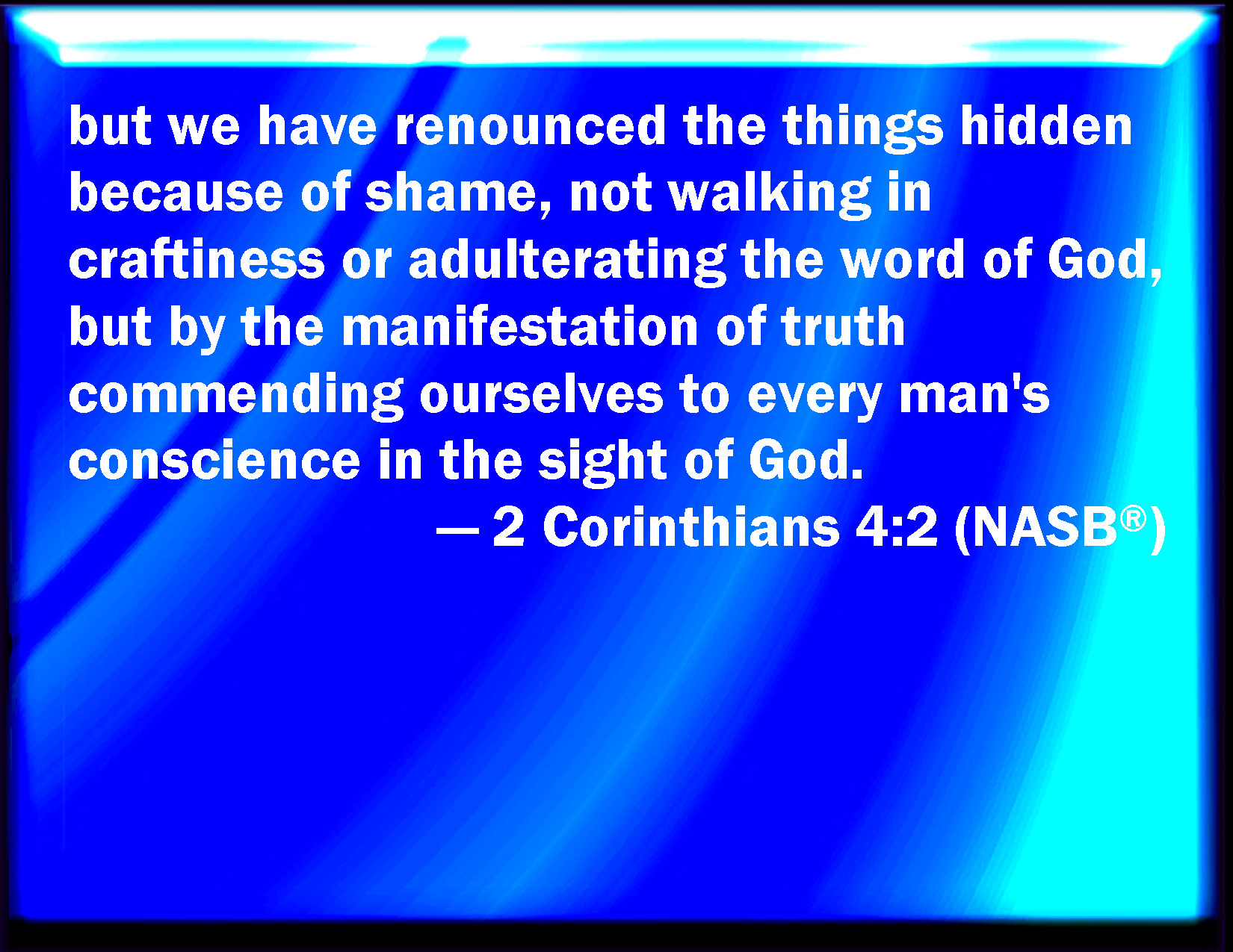 Bible Verse Slide 2 Corinthians 4:2 But have renounced the hidden things of dishonesty, not walking in craftiness, nor handling the word of God deceitfully; but by manifestation of the truth commending ourselves to every man's conscience in the sight of God. KJV: But have renounced the hidden things of dishonesty, not walking in craftiness, nor handling the word of God deceitfully; but by manifestation of the truth commending ourselves to every man's conscience in the sight of God. DRB: But we renounce the hidden things of dishonesty, not walking in craftiness, nor adulterating the word of God; but by manifestation of the truth commending ourselves to every man's conscience, in the sight of God. DBT: But we have rejected the hidden things of shame, not walking in deceit, nor falsifying the word of God, but by manifestation of the truth commending ourselves to every conscience of men before God. ERV: but we have renounced the hidden things of shame, not walking in craftiness, nor handling the word of God deceitfully; but by the manifestation of the truth commending ourselves to every man's conscience in the sight of God. WBT: But have renounced the hidden things of dishonesty; not walking in craftiness, nor handling the word of God deceitfully; but, by manifestation of the truth, commending ourselves to every man's conscience in the sight of God. WEB: But we have renounced the hidden things of shame, not walking in craftiness, nor handling the word of God deceitfully; but by the manifestation of the truth commending ourselves to every man's conscience in the sight of God. YLT: but did renounce for ourselves the hidden things of shame, not walking in craftiness, nor deceitfully using the word of God, but by the manifestation of the truth recommending ourselves unto every conscience of men, before God;Links 2 Corinthians 4:2 NIV • 2 Corinthians 4:2 NLT • 2 Corinthians 4:2 ESV • 2 Corinthians 4:2 NASB • 2 Corinthians 4:2 KJV • 2 Corinthians 4:2 Interlinear • 2 Corinthians 4:2 Commentaries • 2 Corinthians 4:2 Parallel Texts • 2 Corinthians 4:2 Bible Apps • 2 Corinthians 4:2 Parallel • Bible Hub |