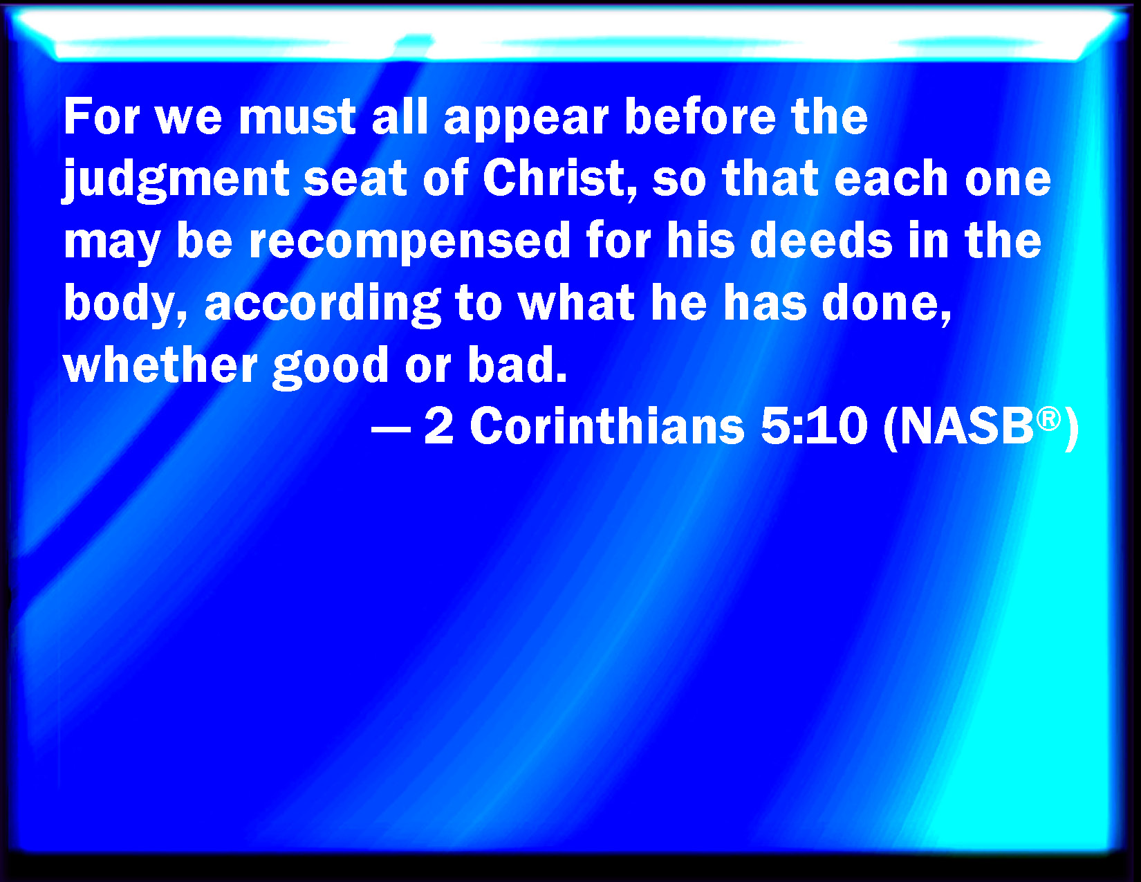 Bible Verse Slide 2 Corinthians 5:10 For we must all appear before the judgment seat of Christ; that every one may receive the things done in his body, according to that he has done, whether it be good or bad. KJV: For we must all appear before the judgment seat of Christ; that every one may receive the things done in his body, according to that he hath done, whether it be good or bad. DRB: For we must all be manifested before the judgement seat of Christ, that every one may receive the proper things of the body, according as he hath done, whether it be good or evil. DBT: For we must all be manifested before the judgment-seat of the Christ, that each may receive the things done in the body, according to those he has done, whether it be good or evil. ERV: For we must all be made manifest before the judgment-seat of Christ; that each one may receive the things done in the body, according to what he hath done, whether it be good or bad. WBT: For we must all appear before the judgment-seat of Christ; that every one may receive the things done in his body, according to what he hath done, whether good or bad. WEB: For we must all be revealed before the judgment seat of Christ; that each one may receive the things in the body, according to what he has done, whether good or bad. YLT: for all of us it behoveth to be manifested before the tribunal of the Christ, that each one may receive the things done through the body, in reference to the things that he did, whether good or evil;Links 2 Corinthians 5:10 NIV • 2 Corinthians 5:10 NLT • 2 Corinthians 5:10 ESV • 2 Corinthians 5:10 NASB • 2 Corinthians 5:10 KJV • 2 Corinthians 5:10 Interlinear • 2 Corinthians 5:10 Commentaries • 2 Corinthians 5:10 Parallel Texts • 2 Corinthians 5:10 Bible Apps • 2 Corinthians 5:10 Parallel • Bible Hub |
