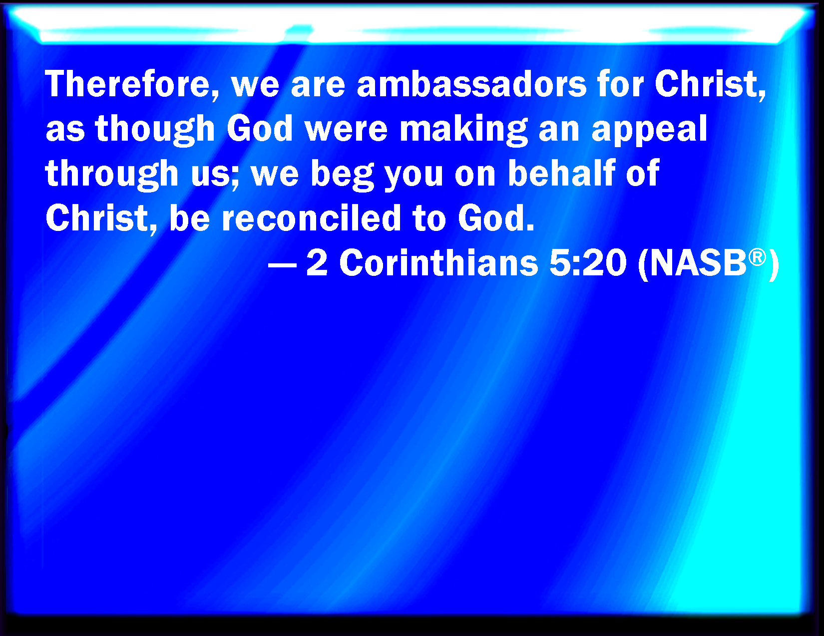 Bible Verse Slide 2 Corinthians 5:20 Now then we are ambassadors for Christ, as though God did beseech you by us: we pray you in Christ's stead, be you reconciled to God. KJV: Now then we are ambassadors for Christ, as though God did beseech you by us: we pray you in Christ's stead, be ye reconciled to God. DRB: For Christ therefore we are ambassadors, God as it were exhorting by us. For Christ, we beseech you, be reconciled to God. DBT: We are ambassadors therefore for Christ, God as it were beseeching by us, we entreat for Christ, Be reconciled to God. ERV: We are ambassadors therefore on behalf of Christ, as though God were entreating by us: we beseech you on behalf of Christ, be ye reconciled to God. WBT: Now then we are embassadors for Christ, as though God did beseech you by us: we pray you in Christ's stead, be ye reconciled to God. WEB: We are therefore ambassadors on behalf of Christ, as though God were entreating by us: we beg you on behalf of Christ, be reconciled to God. YLT: in behalf of Christ, then, we are ambassadors, as if God were calling through us, we beseech, in behalf of Christ, 'Be ye reconciled to God;'Links 2 Corinthians 5:20 NIV • 2 Corinthians 5:20 NLT • 2 Corinthians 5:20 ESV • 2 Corinthians 5:20 NASB • 2 Corinthians 5:20 KJV • 2 Corinthians 5:20 Interlinear • 2 Corinthians 5:20 Commentaries • 2 Corinthians 5:20 Parallel Texts • 2 Corinthians 5:20 Bible Apps • 2 Corinthians 5:20 Parallel • Bible Hub |