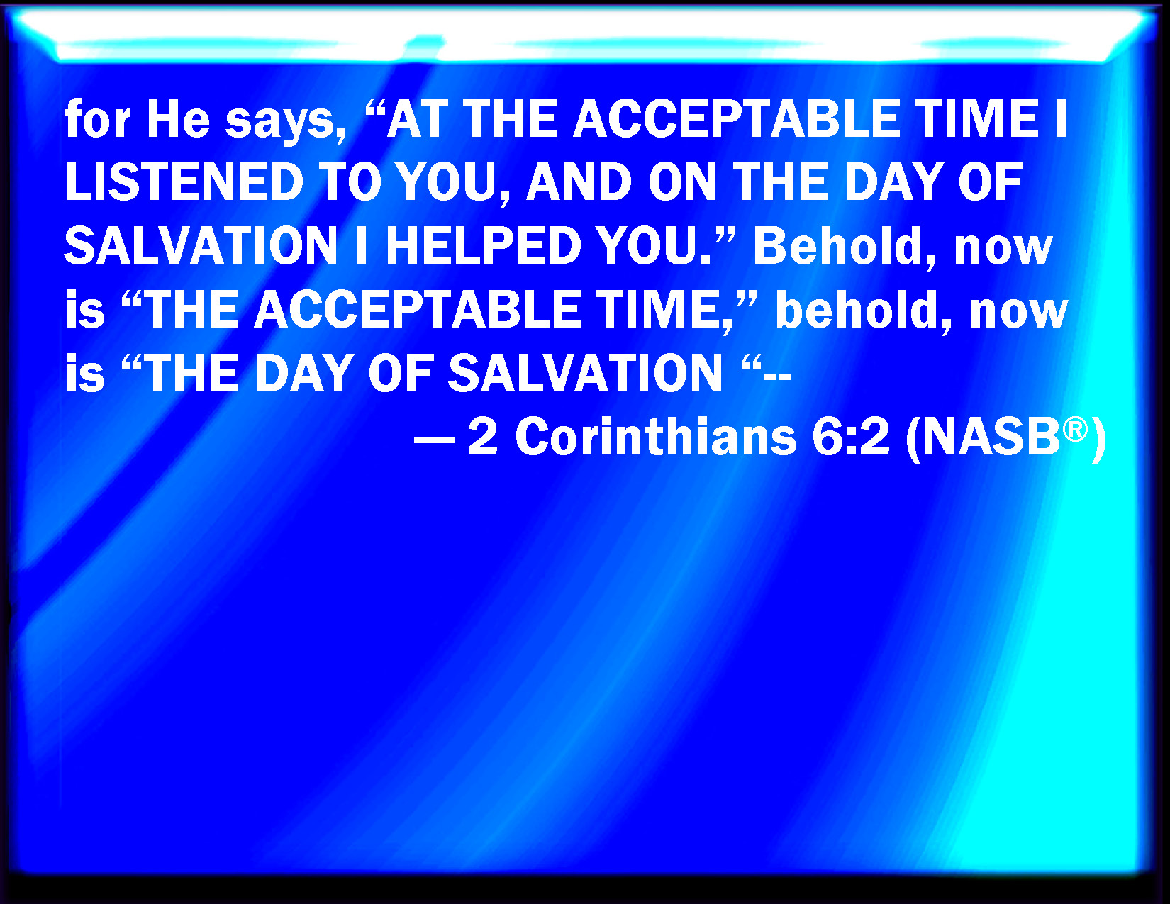 Bible Verse Slide 2 Corinthians 6:2 (For he said, I have heard you in a time accepted, and in the day of salvation have I succored you: behold, now is the accepted time; behold, now is the day of salvation.) KJV: (For he saith, I have heard thee in a time accepted, and in the day of salvation have I succoured thee: behold, now is the accepted time; behold, now is the day of salvation.) DRB: For he saith: In an accepted time have I heard thee; and in the day of salvation have I helped thee. Behold, now is the acceptable time; behold, now is the day of salvation. DBT: (for he says, I have listened to thee in an accepted time, and I have helped thee in a day of salvation: behold, now is the well-accepted time; behold, now the day of salvation:) ERV: (for he saith, At an acceptable time I hearkened unto thee, And in a day of salvation did I succour thee: behold, now is the acceptable time; behold, now is the day of salvation): WBT: (For he saith, I have heard thee in a time accepted, and in the day of salvation have I succored thee: behold, now is the accepted time; behold, now is the day of salvation.) WEB: for he says, "At an acceptable time I listened to you, in a day of salvation I helped you." Behold, now is the acceptable time. Behold, now is the day of salvation. YLT: for He saith, 'In an acceptable time I did hear thee, and in a day of salvation I did help thee, lo, now is a well-accepted time; lo, now, a day of salvation,' — Links 2 Corinthians 6:2 NIV • 2 Corinthians 6:2 NLT • 2 Corinthians 6:2 ESV • 2 Corinthians 6:2 NASB • 2 Corinthians 6:2 KJV • 2 Corinthians 6:2 Interlinear • 2 Corinthians 6:2 Commentaries • 2 Corinthians 6:2 Parallel Texts • 2 Corinthians 6:2 Bible Apps • 2 Corinthians 6:2 Parallel • Bible Hub |