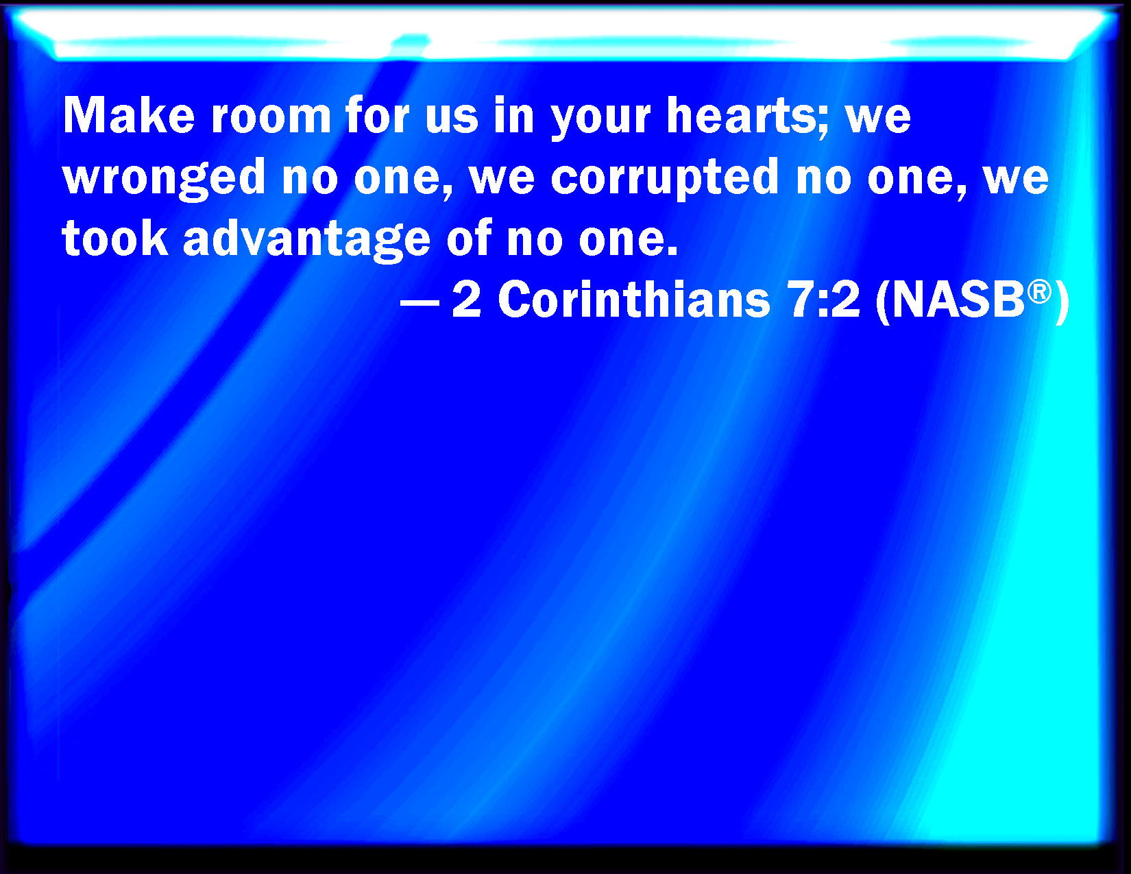 Bible Verse Slide 2 Corinthians 7:2 Receive us; we have wronged no man, we have corrupted no man, we have defrauded no man. KJV: Receive us; we have wronged no man, we have corrupted no man, we have defrauded no man. DRB: Receive us. We have injured no man, we have corrupted no man, we have overreached no man. DBT: Receive us: we have injured no one, we have ruined no one, we have made gain of no one. ERV: Open your hearts to us: we wronged no man, we corrupted no man, we took advantage of no man. WBT: Receive us; we have wronged no man, we have corrupted no man, we have defrauded no man. WEB: Open your hearts to us. We wronged no one. We corrupted no one. We took advantage of no one. YLT: receive us; no one did we wrong; no one did we waste; no one did we defraud;Links 2 Corinthians 7:2 NIV • 2 Corinthians 7:2 NLT • 2 Corinthians 7:2 ESV • 2 Corinthians 7:2 NASB • 2 Corinthians 7:2 KJV • 2 Corinthians 7:2 Interlinear • 2 Corinthians 7:2 Commentaries • 2 Corinthians 7:2 Parallel Texts • 2 Corinthians 7:2 Bible Apps • 2 Corinthians 7:2 Parallel • Bible Hub |