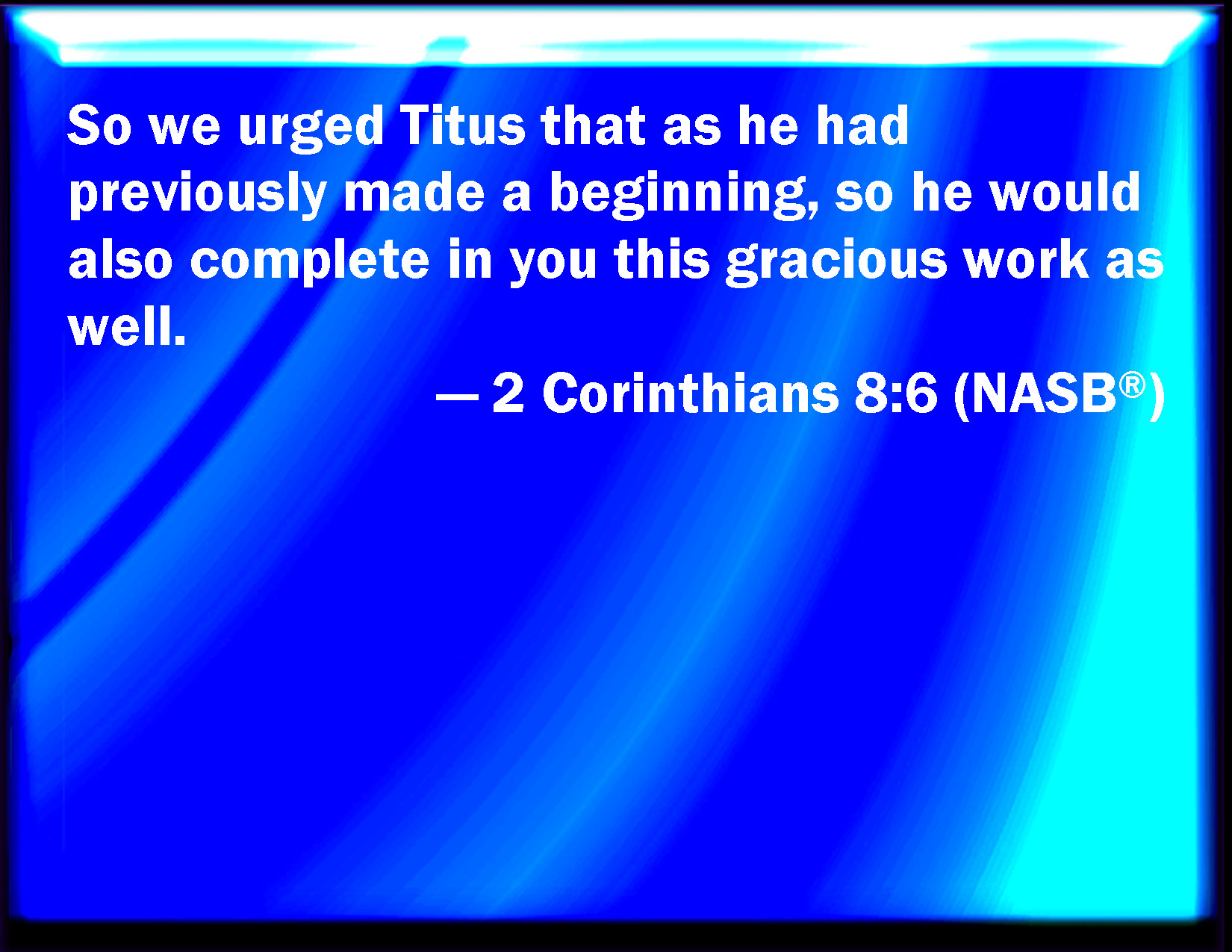 Bible Verse Slide 2 Corinthians 8:6 So that we desired Titus, that as he had begun, so he would also finish in you the same grace also. KJV: Insomuch that we desired Titus, that as he had begun, so he would also finish in you the same grace also. DRB: Insomuch, that we desired Titus, that as he had begun, so also he would finish among you this same grace. DBT: So that we begged Titus that, according as he had before begun, so he would also complete as to you this grace also; ERV: Insomuch that we exhorted Titus, that as he had made a beginning before, so he would also complete in you this grace also. WBT: So that we desired Titus, that as he had begun, so he would also finish in you the same grace also. WEB: So we urged Titus, that as he made a beginning before, so he would also complete in you this grace. YLT: so that we exhorted Titus, that, according as he did begin before, so also he may finish to you also this favour,Links 2 Corinthians 8:6 NIV • 2 Corinthians 8:6 NLT • 2 Corinthians 8:6 ESV • 2 Corinthians 8:6 NASB • 2 Corinthians 8:6 KJV • 2 Corinthians 8:6 Interlinear • 2 Corinthians 8:6 Commentaries • 2 Corinthians 8:6 Parallel Texts • 2 Corinthians 8:6 Bible Apps • 2 Corinthians 8:6 Parallel • Bible Hub |