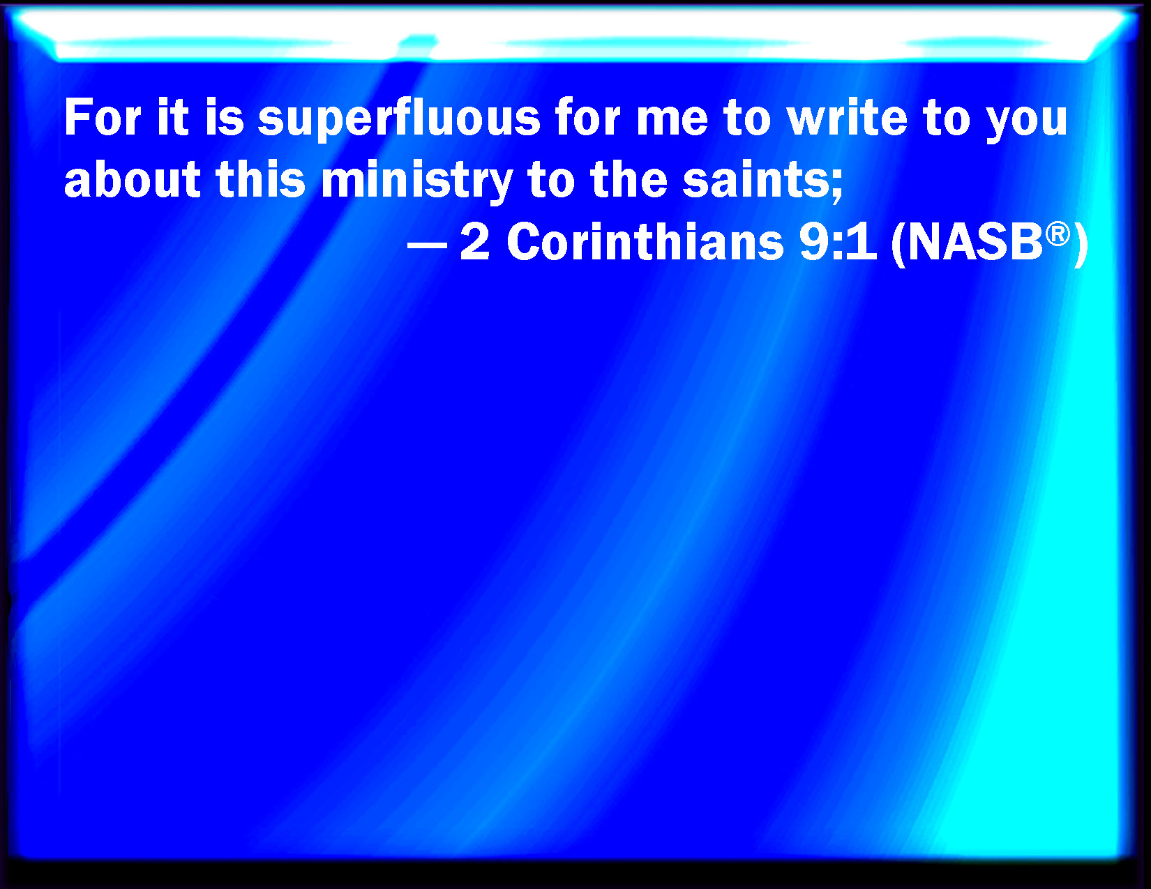 Bible Verse Slide 2 Corinthians 9:1 For as touching the ministering to the saints, it is superfluous for me to write to you: KJV: For as touching the ministering to the saints, it is superfluous for me to write to you: DRB: For concerning the ministry that is done towards the saints, it is superfluous for me to write unto you. DBT: For concerning the ministration which is for the saints, it is superfluous my writing to you. ERV: For as touching the ministering to the saints, it is superfluous for me to write to you: WBT: For as concerning the ministering to the saints, it is superfluous for me to write to you: WEB: It is indeed unnecessary for me to write to you concerning the service to the saints, YLT: For, indeed, concerning the ministration that is for the saints, it is superfluous for me to write to you,Links 2 Corinthians 9:1 NIV • 2 Corinthians 9:1 NLT • 2 Corinthians 9:1 ESV • 2 Corinthians 9:1 NASB • 2 Corinthians 9:1 KJV • 2 Corinthians 9:1 Interlinear • 2 Corinthians 9:1 Commentaries • 2 Corinthians 9:1 Parallel Texts • 2 Corinthians 9:1 Bible Apps • 2 Corinthians 9:1 Parallel • Bible Hub |
