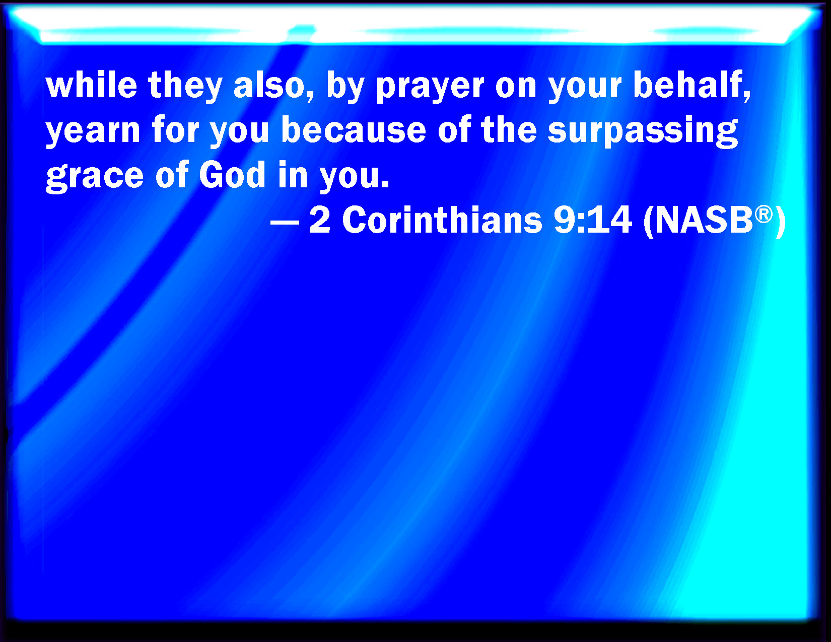 Bible Verse Slide 2 Corinthians 9:14 And by their prayer for you, which long after you for the exceeding grace of God in you. KJV: And by their prayer for you, which long after you for the exceeding grace of God in you. DRB: And in their praying for you, being desirous of you, because of the excellent grace of God in you. DBT: and in their supplication for you, full of ardent desire for you, on account of the exceeding grace of God which is upon you. ERV: while they themselves also, with supplication on your behalf, long after you by reason of the exceeding grace of God in you. WBT: And by their prayer for you, who long after you, for the exceeding grace of God in you. WEB: while they themselves also, with supplication on your behalf, yearn for you by reason of the exceeding grace of God in you. YLT: and by their supplication in your behalf, longing after you because of the exceeding grace of God upon you;Links 2 Corinthians 9:14 NIV • 2 Corinthians 9:14 NLT • 2 Corinthians 9:14 ESV • 2 Corinthians 9:14 NASB • 2 Corinthians 9:14 KJV • 2 Corinthians 9:14 Interlinear • 2 Corinthians 9:14 Commentaries • 2 Corinthians 9:14 Parallel Texts • 2 Corinthians 9:14 Bible Apps • 2 Corinthians 9:14 Parallel • Bible Hub |
