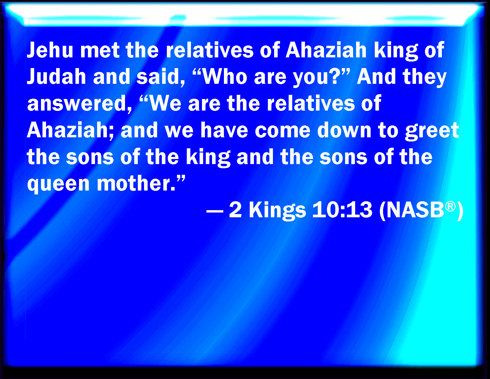 Bible Verse Slide 2 Kings 10:13 Jehu met with the brothers of Ahaziah king of Judah, and said, Who are you? And they answered, We are the brothers of Ahaziah; and we go down to salute the children of the king and the children of the queen. KJV: Jehu met with the brethren of Ahaziah king of Judah, and said, Who are ye? And they answered, We are the brethren of Ahaziah; and we go down to salute the children of the king and the children of the queen. DRB: He met with the brethren of Ochozias king of Juda, and he said to them: Who are you? And they answered: We are the brethren of Ochozias, and are come down to salute the sons of the king, and the sons of the queen. DBT: Jehu found the brethren of Ahaziah king of Judah, and said, Who are ye? And they said, We are the brethren of Ahaziah; and have come down to salute the children of the king, and the children of the queen. ERV: Jehu met with the brethren of Ahaziah king of Judah, and said, Who are ye? And they answered, We are the brethren of Ahaziah: and we go down to salute the children of the king and the children of the queen. WBT: Jehu met with the brethren of Ahaziah king of Judah, and said, Who are ye? And they answered, We are the brethren of Ahaziah; and we go down to salute the children of the king and the children of the queen. WEB: Jehu met with the brothers of Ahaziah king of Judah, and said, "Who are you?" They answered, "We are the brothers of Ahaziah. We are going down to greet the children of the king and the children of the queen." YLT: and Jehu hath found the brethren of Ahaziah king of Judah, and saith, 'Who are ye?' and they say, 'Brethren of Ahaziah we are, and we go down to salute the sons of the king, and the sons of the mistress.'Links 2 Kings 10:13 NIV • 2 Kings 10:13 NLT • 2 Kings 10:13 ESV • 2 Kings 10:13 NASB • 2 Kings 10:13 KJV • 2 Kings 10:13 Interlinear • 2 Kings 10:13 Commentaries • 2 Kings 10:13 Parallel Texts • 2 Kings 10:13 Bible Apps • 2 Kings 10:13 Parallel • Bible Hub |