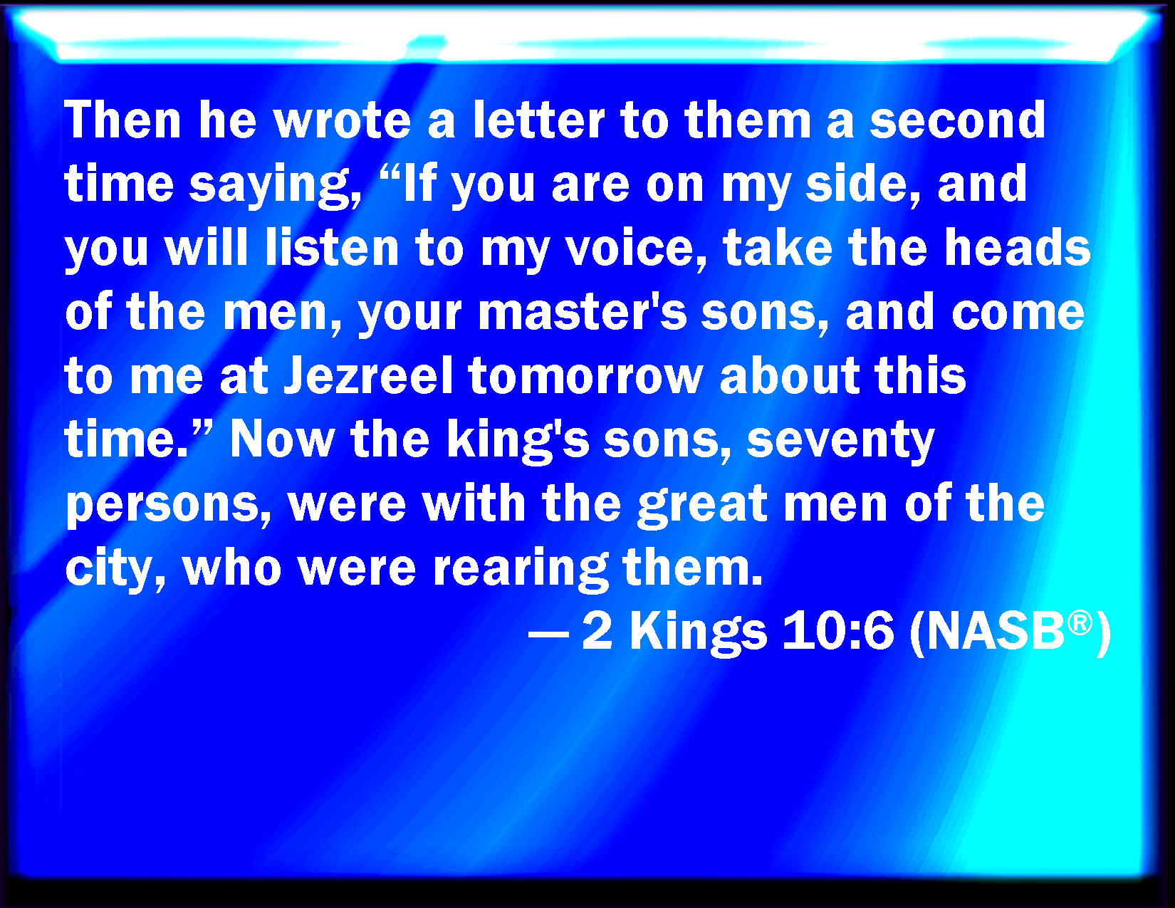 Bible Verse Slide 2 Kings 10:6 Then he wrote a letter the second time to them, saying, If you be mine, and if you will listen to my voice, take you the heads of the men your master's sons, and come to me to Jezreel by to morrow this time. Now the king's sons, being seventy persons, were with the great men of the city, which brought them up. KJV: Then he wrote a letter the second time to them, saying, If ye be mine, and if ye will hearken unto my voice, take ye the heads of the men your master's sons, and come to me to Jezreel by to morrow this time. Now the king's sons, being seventy persons, were with the great men of the city, which brought them up. DRB: And he wrote letters the second time to them, saying: If you be mine, and will obey me, take the heads of the sons of your master, and come to me to Jezrahel by to morrow this time. Now the king's sons, being seventy men, were brought up with the chief men of the city. DBT: And he wrote a letter the second time to them saying, If ye are mine, and will hearken to my voice, take the heads of the men your master's sons, and come to me to Jizreel to-morrow at this time. Now the king's sons, seventy persons, were with the great men of the city, who brought them up. ERV: Then he wrote a letter the second time to them, saying, If ye be on my side, and if ye will hearken unto my voice, take ye the heads of the men your master's sons, and come to me to Jezreel by tomorrow this time. Now the king's sons, being seventy persons, were with the great men of the city, which brought them up. WBT: Then he wrote a letter the second time to them, saying, if ye are mine, and if ye will hearken to my voice, take ye the heads of the men your master's sons, and come to me to Jezreel by to-morrow this time. Now the king's sons being seventy persons, were with the great men of the city, who brought them up. WEB: Then he wrote a letter the second time to them, saying, "If you are on my side, and if you will listen to my voice, take the heads of the men your master's sons, and come to me to Jezreel by tomorrow this time." Now the king's sons, being seventy persons, were with the great men of the city, who brought them up. YLT: And he writeth unto them a letter a second time, saying, 'If ye are for me, and to my voice are hearkening, take the heads of the men — the sons of your lord, and come unto me about this time to-morrow, to Jezreel;' and the sons of the king are seventy men, with the great ones of the city those bringing them up.Links 2 Kings 10:6 NIV • 2 Kings 10:6 NLT • 2 Kings 10:6 ESV • 2 Kings 10:6 NASB • 2 Kings 10:6 KJV • 2 Kings 10:6 Interlinear • 2 Kings 10:6 Commentaries • 2 Kings 10:6 Parallel Texts • 2 Kings 10:6 Bible Apps • 2 Kings 10:6 Parallel • Bible Hub |