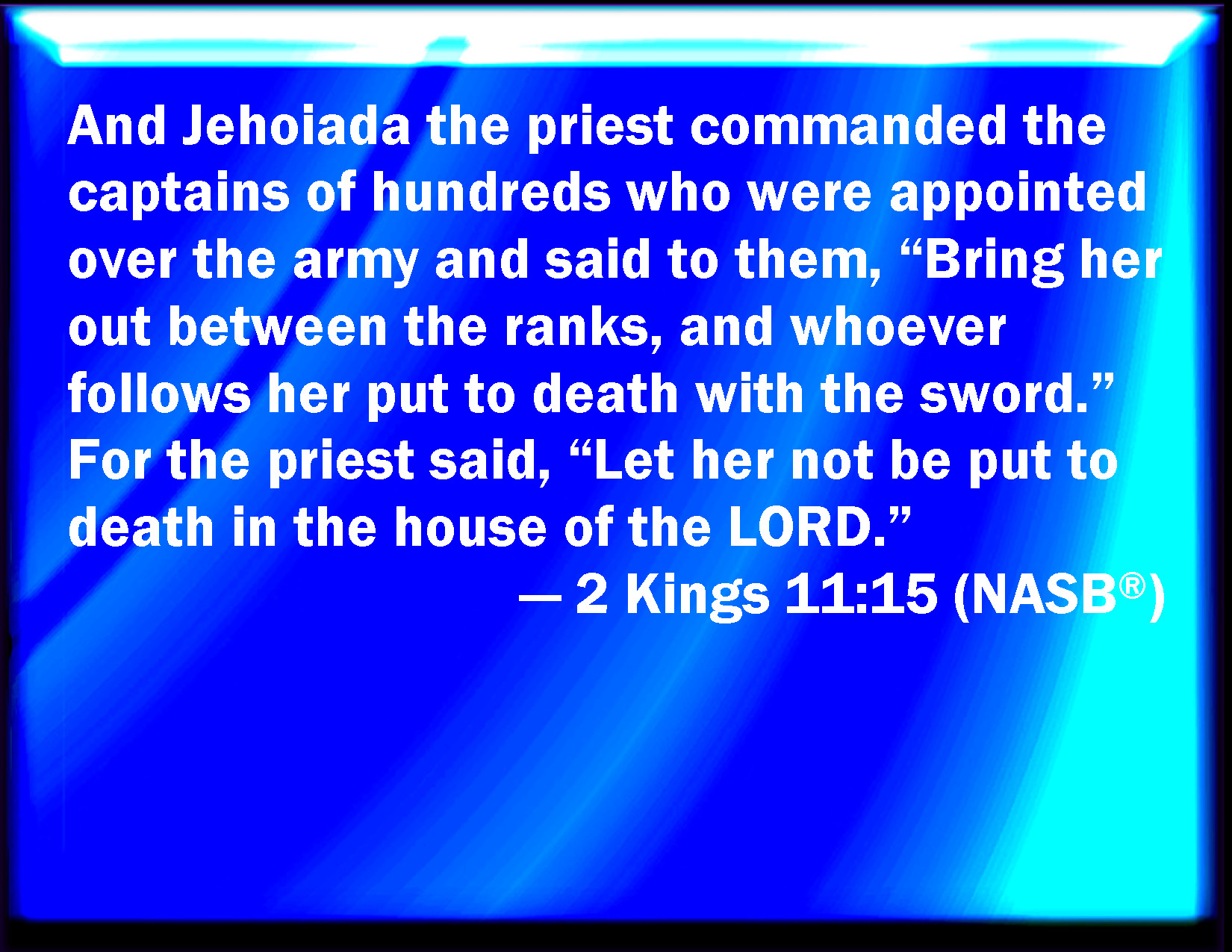 Bible Verse Slide 2 Kings 11:15 But Jehoiada the priest commanded the captains of the hundreds, the officers of the host, and said to them, Have her forth without the ranges: and him that follows her kill with the sword. For the priest had said, Let her not be slain in the house of the LORD. KJV: But Jehoiada the priest commanded the captains of the hundreds, the officers of the host, and said unto them, Have her forth without the ranges: and him that followeth her kill with the sword. For the priest had said, Let her not be slain in the house of the LORD. DRB: But Joiada commended the centurions that were over the army, and said to them: Have her forth without the precinct of the temple, and whosoever shall follow her, let him be slain with the sword. For the priest had said: Let her not be slain in the temple of the Lord. DBT: And Jehoiada the priest commanded the captains of the hundreds that were set over the host, and said to them, Lead her forth without the ranks; and whosoever follows her, slay with the sword; for the priest said, Let her not be put to death in the house of Jehovah. ERV: And Jehoiada the priest commanded the captains of hundreds that were set over the host, and said unto them, Have her forth between the ranks; and him that followeth her slay with the sword: for the priest said, Let her not be slain in the house of the LORD. WBT: But Jehoiada the priest commanded the captains of the hundreds, the officers of the host, and said to them, Have her forth without the ranges: and him that followeth her kill with the sword. For the priest had said, Let her not be slain in the house of the LORD. WEB: Jehoiada the priest commanded the captains of hundreds who were set over the army, and said to them, "Bring her out between the ranks. Kill him who follows her with the sword." For the priest said, "Don't let her be slain in the house of Yahweh." YLT: And Jehoiada the priest commandeth the heads of the hundreds, inspectors of the force, and saith unto them, 'Bring her out unto the outside of the ranges, and him who is going after her, put to death by the sword:' for the priest had said, 'Let her not be put to death in the house of Jehovah.'Links 2 Kings 11:15 NIV • 2 Kings 11:15 NLT • 2 Kings 11:15 ESV • 2 Kings 11:15 NASB • 2 Kings 11:15 KJV • 2 Kings 11:15 Interlinear • 2 Kings 11:15 Commentaries • 2 Kings 11:15 Parallel Texts • 2 Kings 11:15 Bible Apps • 2 Kings 11:15 Parallel • Bible Hub |