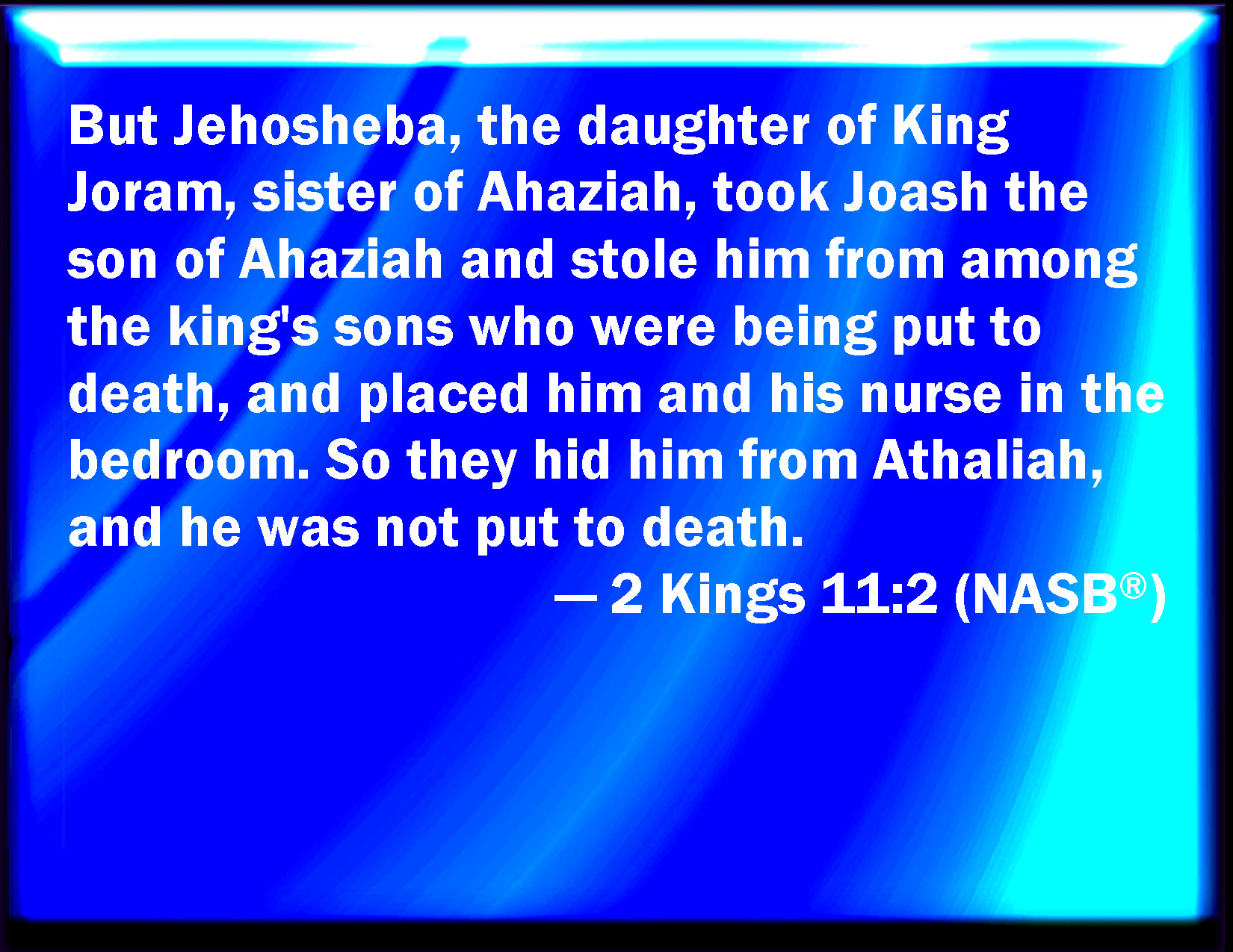 Bible Verse Slide 2 Kings 11:2 But Jehosheba, the daughter of king Joram, sister of Ahaziah, took Joash the son of Ahaziah, and stole him from among the king's sons which were slain; and they hid him, even him and his nurse, in the bedchamber from Athaliah, so that he was not slain. KJV: But Jehosheba, the daughter of king Joram, sister of Ahaziah, took Joash the son of Ahaziah, and stole him from among the king's sons which were slain; and they hid him, even him and his nurse, in the bedchamber from Athaliah, so that he was not slain. DRB: But Josaba the daughter of king Joram, sister of Ochozias, took Joas the son of Ochozias, and stole him from among the king's sons that were slain, out of the bedchamber with his nurse: and hid him from the face of Athalia, so that he was not slain. DBT: But Jehosheba, the daughter of king Joram, the sister of Ahaziah, took Joash the son of Ahaziah and stole him from among the king's sons that were slain, and hid him and his nurse in the bedchamber; and they hid him from Athaliah, so that he was not slain. ERV: But Jehosheba, the daughter of king Joram, sister of Ahaziah, took Joash the son of Ahaziah, and stole him away from among the king's sons that were slain, even him and his nurse, and put them in the bedchamber; and they hid him from Athaliah, so that he was not slain. WBT: But Jehosheba, the daughter of king Joram, sister of Ahaziah, took Joash the the son of Ahaziah, and stole him from among the king's sons who were slain; and they hid him, even him and his nurse, in the bed-chamber, from Athaliah, so that he was not slain. WEB: But Jehosheba, the daughter of king Joram, sister of Ahaziah, took Joash the son of Ahaziah, and stole him away from among the king's sons who were slain, even him and his nurse, [and put them] in the bedroom; and they hid him from Athaliah, so that he was not slain; YLT: and Jehosheba daughter of king Joram, sister of Ahaziah, taketh Joash son of Ahaziah, and stealeth him out of the midst of the sons of the king who are put to death, him and his nurse, in the inner part of the bed-chambers, and they hide him from the presence of Athaliah, and he hath not been put to death,Links 2 Kings 11:2 NIV • 2 Kings 11:2 NLT • 2 Kings 11:2 ESV • 2 Kings 11:2 NASB • 2 Kings 11:2 KJV • 2 Kings 11:2 Interlinear • 2 Kings 11:2 Commentaries • 2 Kings 11:2 Parallel Texts • 2 Kings 11:2 Bible Apps • 2 Kings 11:2 Parallel • Bible Hub |