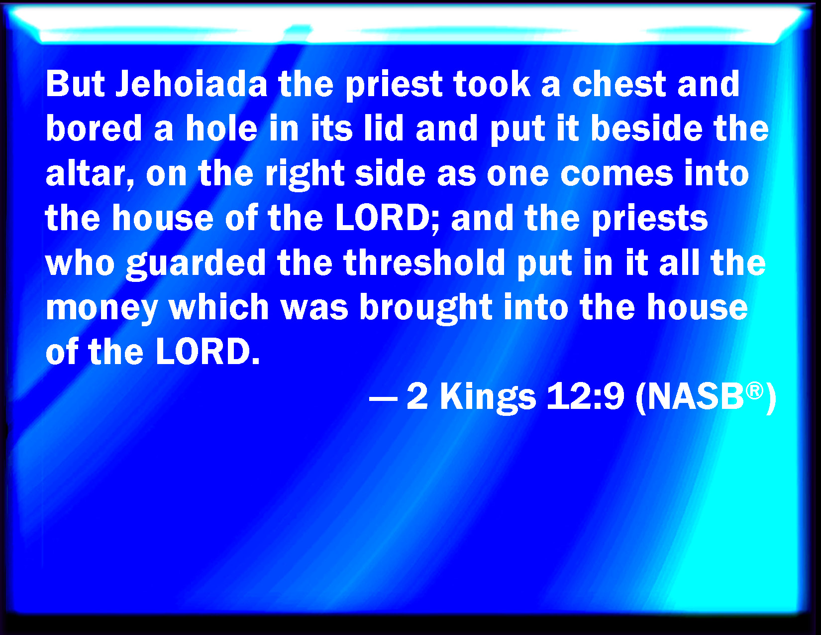 Bible Verse Slide 2 Kings 12:9 But Jehoiada the priest took a chest, and bored a hole in the lid of it, and set it beside the altar, on the right side as one comes into the house of the LORD: and the priests that kept the door put therein all the money that was brought into the house of the LORD. KJV: But Jehoiada the priest took a chest, and bored a hole in the lid of it, and set it beside the altar, on the right side as one cometh into the house of the LORD: and the priests that kept the door put therein all the money that was brought into the house of the LORD. DRB: And Joiada the high priest took a chest and bored a hole in the top, and set it by the altar at the right hand of them that came into the house of the Lord, and the priests that kept the doors put therein all the money that was brought to the temple of the Lord. DBT: And Jehoiada the priest took a chest, and bored a hole in the lid, and set it beside the altar, on the right side as one comes into the house of Jehovah; and the priests that kept the door put into it all the money brought into the house of Jehovah. ERV: But Jehoiada the priest took a chest, and bored a hole in the lid of it, and set it beside the altar, on the right side as one cometh into the house of the LORD: and the priests that kept the door put therein all the money that was brought into the house of the LORD. WBT: But Jehoiada the priest took a chest, and bored a hole in the lid of it, and set it beside the altar, on the right side as one cometh into the house of the LORD: and the priests that kept the door put in it all the money that was brought into the house of the LORD. WEB: But Jehoiada the priest took a chest, and bored a hole in its lid, and set it beside the altar, on the right side as one comes into the house of Yahweh: and the priests who kept the threshold put therein all the money that was brought into the house of Yahweh. YLT: and Jehoiada the priest taketh a chest, and pierceth a hole in its lid, and putteth it near the altar, on the right side, as one cometh in to the house of Jehovah, and the priests keeping the threshold have put there all the money that is brought in to the house of Jehovah.Links 2 Kings 12:9 NIV • 2 Kings 12:9 NLT • 2 Kings 12:9 ESV • 2 Kings 12:9 NASB • 2 Kings 12:9 KJV • 2 Kings 12:9 Interlinear • 2 Kings 12:9 Commentaries • 2 Kings 12:9 Parallel Texts • 2 Kings 12:9 Bible Apps • 2 Kings 12:9 Parallel • Bible Hub |