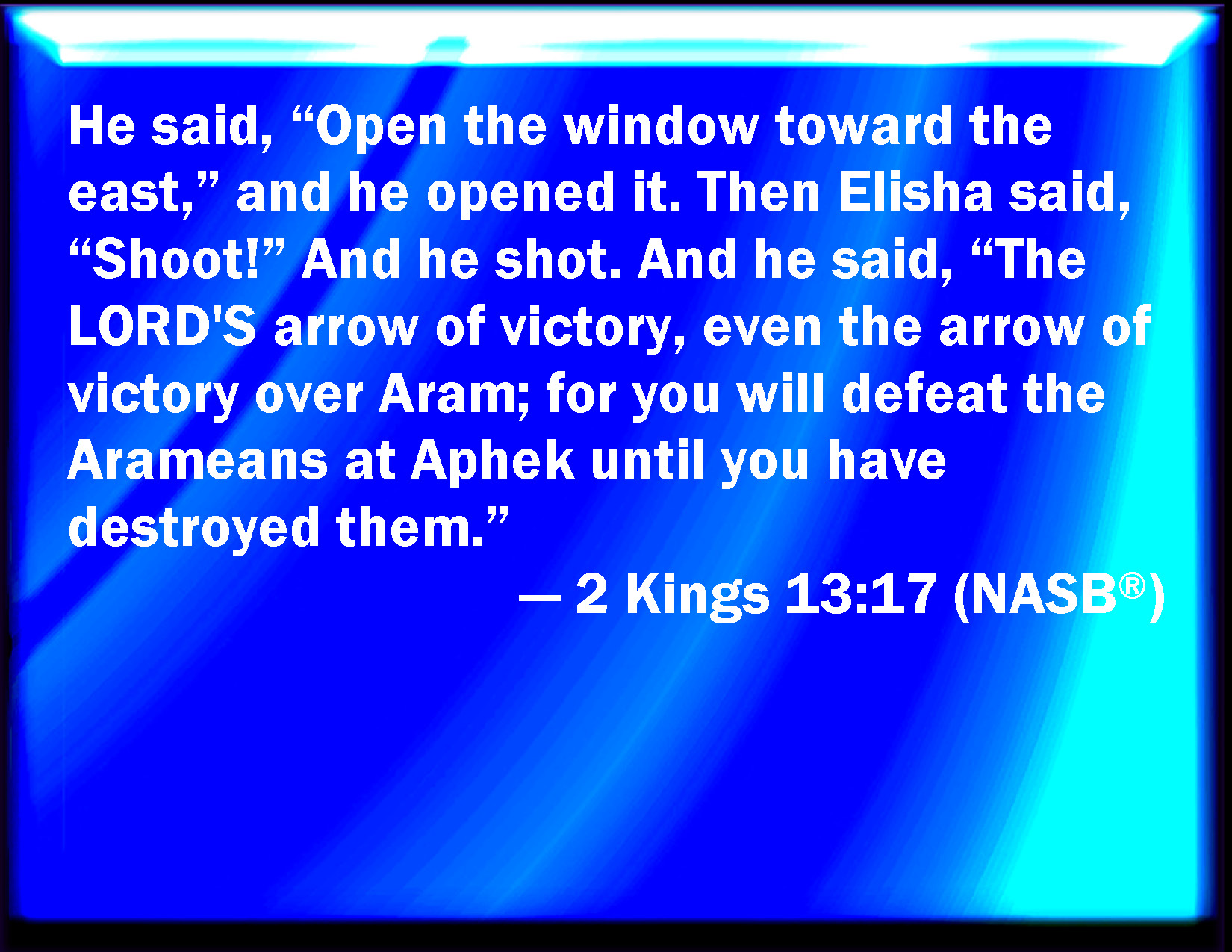 Bible Verse Slide 2 Kings 13:17 And he said, Open the window eastward. And he opened it. Then Elisha said, Shoot. And he shot. And he said, The arrow of the LORD's deliverance, and the arrow of deliverance from Syria: for you shall smite the Syrians in Aphek, till you have consumed them. KJV: And he said, Open the window eastward. And he opened it. Then Elisha said, Shoot. And he shot. And he said, The arrow of the LORD'S deliverance, and the arrow of deliverance from Syria: for thou shalt smite the Syrians in Aphek, till thou have consumed them. DRB: And said: Open the window to the east. And when he had opened it, Eliseus said: Shoot an arrow. And he shot. And Eliseus said: The arrow of the Lord's deliverance, and the arrow of the deliverance from Syria: and thou shalt strike the Syrians in Aphec, till thou consume them. DBT: and said, Open the window eastward. And he opened it. And Elisha said, Shoot. And he shot. And he said, An arrow of Jehovah's deliverance, even an arrow of deliverance from the Syrians; and thou shalt smite the Syrians in Aphek, till thou hast consumed them. ERV: And he said, Open the window eastward: and he opened it. Then Elisha said, Shoot: and he shot. And he said, The LORD'S arrow of victory, even the arrow of victory over Syria: for thou shalt smite the Syrians in Aphek, till thou have consumed them. WBT: And he said, Open the window eastward. And he opened it. Then Elisha said, Shoot. And he shot. And he said, The arrow of the LORD'S deliverance, and the arrow of deliverance from Syria: for thou shalt smite the Syrians in Aphek, till thou hast consumed them. WEB: He said, "Open the window eastward;" and he opened it. Then Elisha said, "Shoot!" and he shot. He said, "Yahweh's arrow of victory, even the arrow of victory over Syria; for you shall strike the Syrians in Aphek, until you have consumed them." YLT: and saith, 'Open the window eastward;' and he openeth, and Elisha saith, 'Shoot,' and he shooteth; and he saith, 'An arrow of salvation to Jehovah, and an arrow of salvation against Aram, and thou hast smitten Aram, in Aphek, till consuming.'Links 2 Kings 13:17 NIV • 2 Kings 13:17 NLT • 2 Kings 13:17 ESV • 2 Kings 13:17 NASB • 2 Kings 13:17 KJV • 2 Kings 13:17 Interlinear • 2 Kings 13:17 Commentaries • 2 Kings 13:17 Parallel Texts • 2 Kings 13:17 Bible Apps • 2 Kings 13:17 Parallel • Bible Hub |