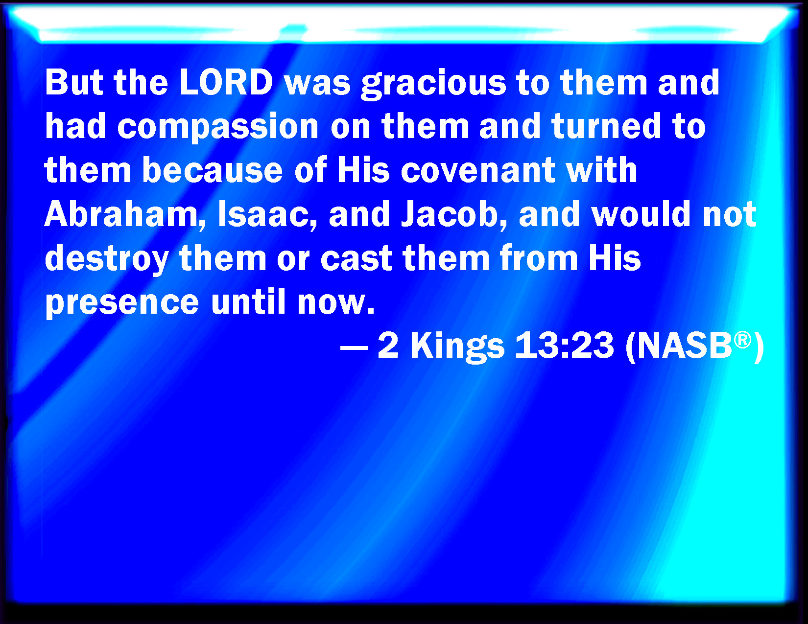 Bible Verse Slide 2 Kings 13:23 And the LORD was gracious to them, and had compassion on them, and had respect to them, because of his covenant with Abraham, Isaac, and Jacob, and would not destroy them, neither cast he them from his presence as yet. KJV: And the LORD was gracious unto them, and had compassion on them, and had respect unto them, because of his covenant with Abraham, Isaac, and Jacob, and would not destroy them, neither cast he them from his presence as yet. DRB: And the Lord had mercy on them, and returned to them because of his covenant, which he had made with Abraham and Isaac and Jacob: and he would not destroy them, nor utterly cast them away, unto this present time. DBT: And Jehovah was gracious to them, and had compassion on them, and had respect to them, because of his covenant with Abraham, Isaac, and Jacob; and he would not destroy them, neither did he cast them from his presence up to that time. ERV: But the LORD was gracious unto them, and had compassion on them, and had respect unto them, because of his covenant with Abraham, Isaac, and Jacob, and would not destroy them, neither cast he them from his presence as yet. WBT: And the LORD was gracious to them, and had compassion on them, and had respect to them, because of his covenant with Abraham, Isaac, and Jacob, and would not destroy them, neither did he as yet reject them from his presence. WEB: But Yahweh was gracious to them, and had compassion on them, and had respect to them, because of his covenant with Abraham, Isaac, and Jacob, and would not destroy them, neither cast he them from his presence as yet. YLT: and Jehovah doth favour them, and pity them, and turn unto them, for the sake of His covenant with Abraham, Isaac, and Jacob, and hath not been willing to destroy them, nor to cast them from His presence as yet.Links 2 Kings 13:23 NIV • 2 Kings 13:23 NLT • 2 Kings 13:23 ESV • 2 Kings 13:23 NASB • 2 Kings 13:23 KJV • 2 Kings 13:23 Interlinear • 2 Kings 13:23 Commentaries • 2 Kings 13:23 Parallel Texts • 2 Kings 13:23 Bible Apps • 2 Kings 13:23 Parallel • Bible Hub |