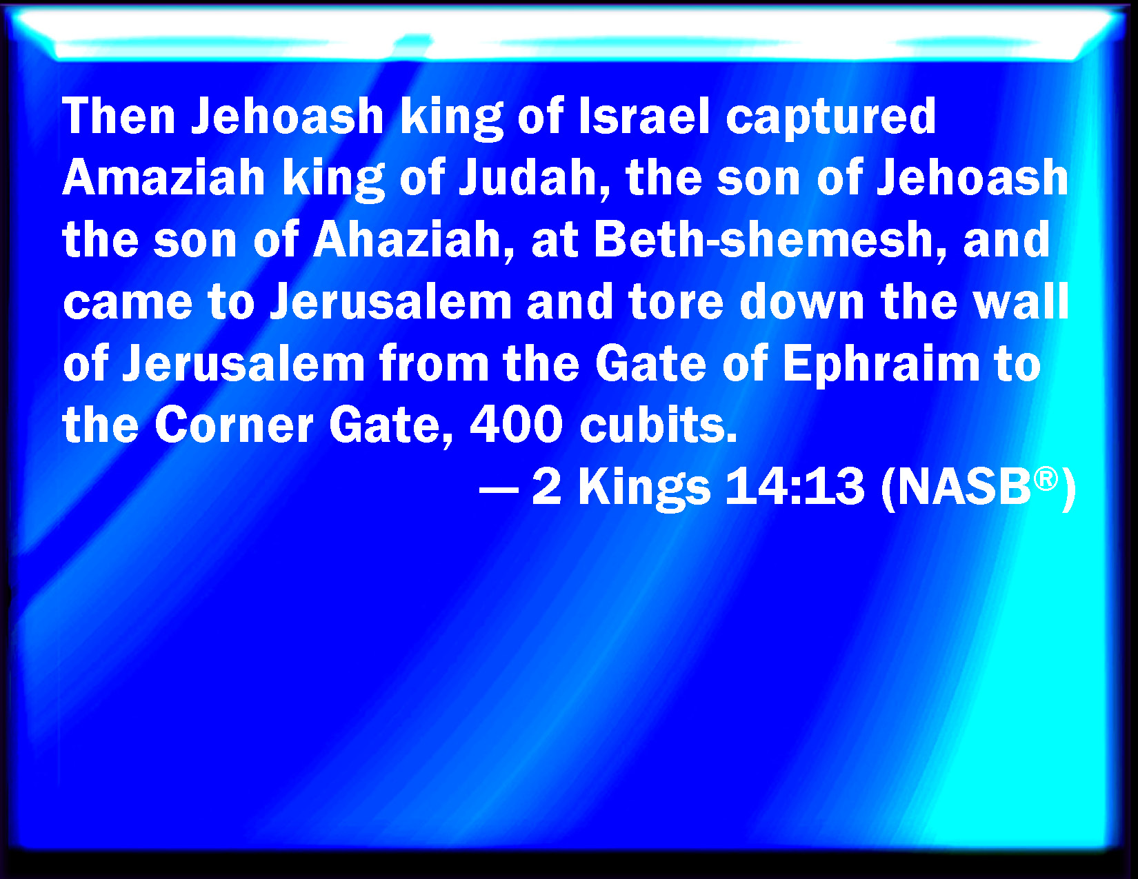 Bible Verse Slide 2 Kings 14:13 And Jehoash king of Israel took Amaziah king of Judah, the son of Jehoash the son of Ahaziah, at Bethshemesh, and came to Jerusalem, and broke down the wall of Jerusalem from the gate of Ephraim to the corner gate, four hundred cubits. KJV: And Jehoash king of Israel took Amaziah king of Judah, the son of Jehoash the son of Ahaziah, at Bethshemesh, and came to Jerusalem, and brake down the wall of Jerusalem from the gate of Ephraim unto the corner gate, four hundred cubits. DRB: But Joas king of Israel took Amasias, king of Juda the son of Joas, the son of Ochozias, in Bethsames, and brought him into Jerusalem: and he broke down the wall of Jerusalem, from the gate of Ephraim to the gate of the corner, four hundred cubits. DBT: And Jehoash king of Israel took Amaziah king of Judah, the son of Jehoash son of Ahaziah, at Beth-shemesh, and came to Jerusalem, and broke down the wall of Jerusalem from the gate of Ephraim to the corner-gate, four hundred cubits. ERV: And Jehoash king of Israel took Amaziah king of Judah, the son of Jehoash the son of Ahaziah, at Beth-shemesh, and came to Jerusalem, and brake down the wall of Jerusalem from the gate of Ephraim unto the corner gate, four hundred cubists. WBT: And Jehoash king of Israel took Amaziah king of Judah, the son of Jehoash the son of Ahaziah, at Beth-shemesh, and came to Jerusalem, and broke down the wall of Jerusalem from the gate of Ephraim to the corner gate, four hundred cubits. WEB: Jehoash king of Israel took Amaziah king of Judah, the son of Jehoash the son of Ahaziah, at Beth Shemesh, and came to Jerusalem, and broke down the wall of Jerusalem from the gate of Ephraim to the corner gate, four hundred cubits. YLT: And Amaziah king of Judah, son of Jehoash son of Ahaziah, caught hath Jehoash king of Israel in Beth-Shemesh, and they come in to Jerusalem, and he bursteth through the wall of Jerusalem, at the gate of Ephraim unto the gate of the corner, four hundred cubits,Links 2 Kings 14:13 NIV • 2 Kings 14:13 NLT • 2 Kings 14:13 ESV • 2 Kings 14:13 NASB • 2 Kings 14:13 KJV • 2 Kings 14:13 Interlinear • 2 Kings 14:13 Commentaries • 2 Kings 14:13 Parallel Texts • 2 Kings 14:13 Bible Apps • 2 Kings 14:13 Parallel • Bible Hub |