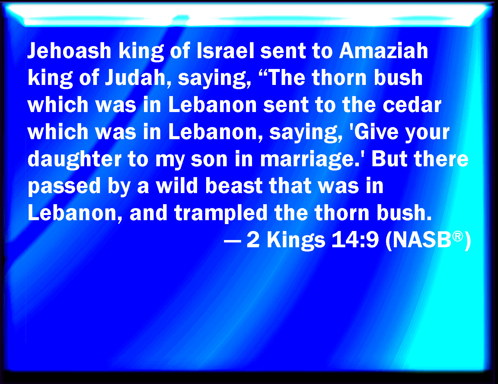 Bible Verse Slide 2 Kings 14:9 And Jehoash the king of Israel sent to Amaziah king of Judah, saying, The thistle that was in Lebanon sent to the cedar that was in Lebanon, saying, Give your daughter to my son to wife: and there passed by a wild beast that was in Lebanon, and stepped down the thistle. KJV: And Jehoash the king of Israel sent to Amaziah king of Judah, saying, The thistle that was in Lebanon sent to the cedar that was in Lebanon, saying, Give thy daughter to my son to wife: and there passed by a wild beast that was in Lebanon, and trode down the thistle. DRB: And Joas king of Israel sent again to Amasias king of Juda, saying: A thistle of Libanus sent to a cedar tree, which is in Libanus, saying: Give thy daughter to my son to wife. And the beasts of the forest, that are in Libanus, passed and trod down the thistle. DBT: And Jehoash king of Israel sent to Amaziah king of Judah, saying, The thorn-bush that is in Lebanon sent to the cedar that is in Lebanon, saying, Give thy daughter to my son as wife; and there passed by the wild beast that is in Lebanon, and trode down the thorn-bush. ERV: And Jehoash the king of Israel sent to Amaziah king of Judah, saying, The thistle that was in Lebanon sent to the cedar that was in Lebanon, saying, Give thy daughter to my son to wife: and there passed by a wild beast that was in Lebanon, and trode down the thistle. WBT: And Jehoash the king of Israel sent to Amaziah king of Judah, saying, The thistle that was in Lebanon sent to the cedar that was in Lebanon, saying, Give thy daughter to my son for a wife: and there passed by a wild beast that was in Lebanon, and trod down the thistle. WEB: Jehoash the king of Israel sent to Amaziah king of Judah, saying, "The thistle that was in Lebanon sent to the cedar that was in Lebanon, saying, 'Give your daughter to my son as wife. Then a wild animal that was in Lebanon passed by, and trampled down the thistle. YLT: And Jehoash king of Israel sendeth unto Amaziah king of Judah, saying, 'The thorn that is in Lebanon hath sent unto the cedar that is in Lebanon, saying, Give thy daughter to my son for a wife; and pass by doth a beast of the field that is in Lebanon, and treadeth down the thorn.Links 2 Kings 14:9 NIV • 2 Kings 14:9 NLT • 2 Kings 14:9 ESV • 2 Kings 14:9 NASB • 2 Kings 14:9 KJV • 2 Kings 14:9 Interlinear • 2 Kings 14:9 Commentaries • 2 Kings 14:9 Parallel Texts • 2 Kings 14:9 Bible Apps • 2 Kings 14:9 Parallel • Bible Hub |