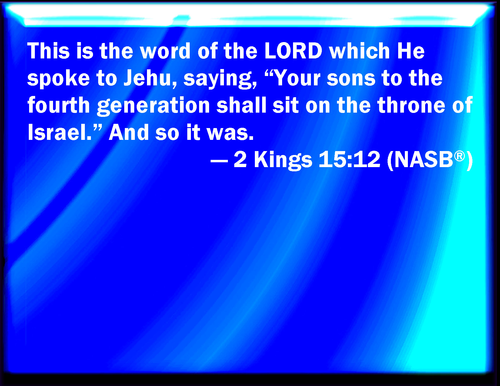 Bible Verse Slide 2 Kings 15:12 This was the word of the LORD which he spoke to Jehu, saying, Your sons shall sit on the throne of Israel to the fourth generation. And so it came to pass. KJV: This was the word of the LORD which he spake unto Jehu, saying, Thy sons shall sit on the throne of Israel unto the fourth generation. And so it came to pass. DRB: This was the word of the Lord, which he spoke to Jehu, saying: Thy children to the fourth generation shall sit upon the throne of Israel. And so it came to pass. DBT: This was the word of Jehovah which he spoke to Jehu saying, Thy sons shall sit upon the throne of Israel unto the fourth generation. And so it came to pass. ERV: This was the word of the LORD which he spake unto Jehu, saying, Thy sons to the fourth generation shall sit upon the throne of Israel. And so it came to pass. WBT: This was the word of the LORD which he spoke to Jehu, saying, Thy sons shall sit on the throne of Israel to the fourth generation. And so it came to pass. WEB: This was the word of Yahweh which he spoke to Jehu, saying, "Your sons to the fourth generation shall sit on the throne of Israel." So it came to pass. YLT: It is the word of Jehovah that He spake unto Jehu, saying, 'Sons of the fourth generation do sit for thee on the throne of Israel;' and it is so.Links 2 Kings 15:12 NIV • 2 Kings 15:12 NLT • 2 Kings 15:12 ESV • 2 Kings 15:12 NASB • 2 Kings 15:12 KJV • 2 Kings 15:12 Interlinear • 2 Kings 15:12 Commentaries • 2 Kings 15:12 Parallel Texts • 2 Kings 15:12 Bible Apps • 2 Kings 15:12 Parallel • Bible Hub |