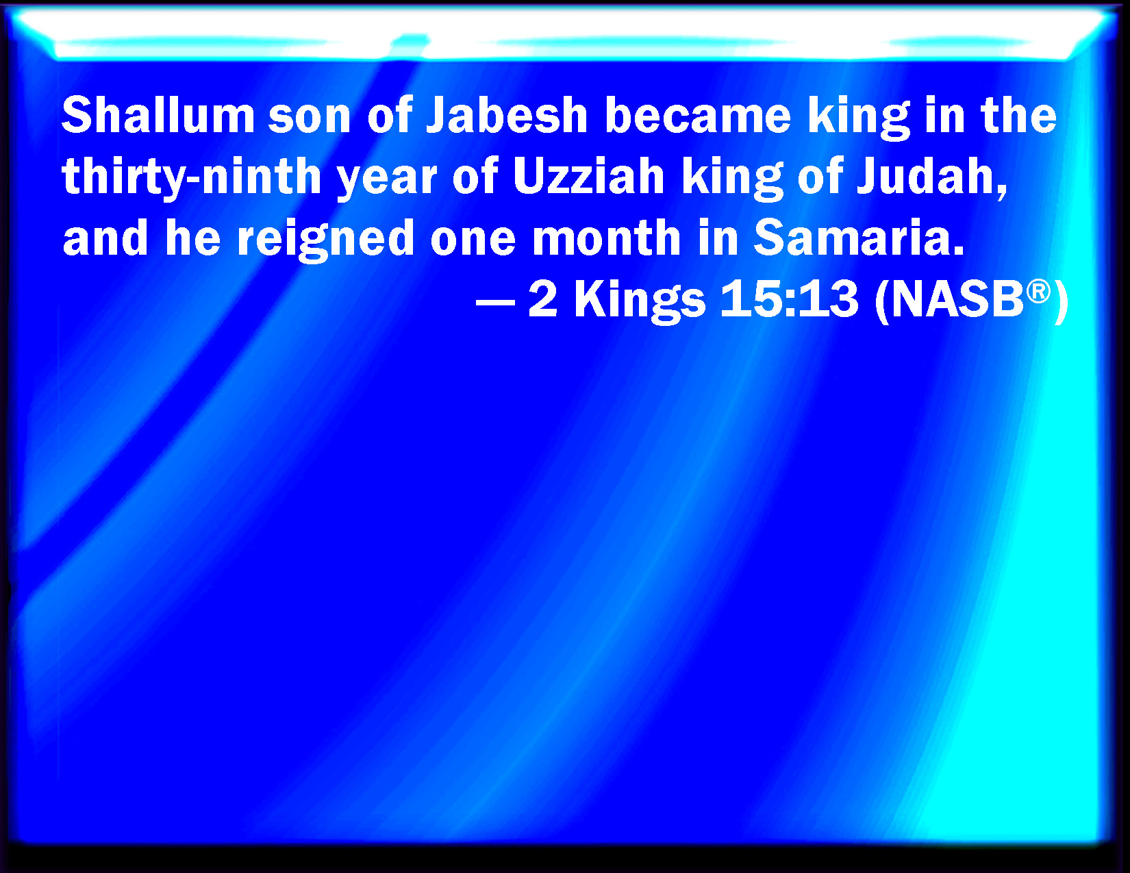 2 Kings 15:13 Shallum the son of Jabesh began to reign in the nine and thirtieth year of Uzziah king of Judah; and he reigned a full month in Samaria.