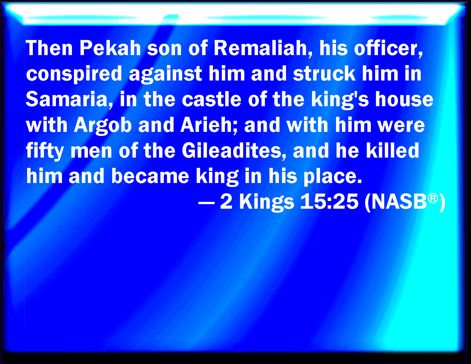 Bible Verse Slide 2 Kings 15:25 But Pekah the son of Remaliah, a captain of his, conspired against him, and smote him in Samaria, in the palace of the king's house, with Argob and Arieh, and with him fifty men of the Gileadites: and he killed him, and reigned in his room. KJV: But Pekah the son of Remaliah, a captain of his, conspired against him, and smote him in Samaria, in the palace of the king's house, with Argob and Arieh, and with him fifty men of the Gileadites: and he killed him, and reigned in his room. DRB: And Phacee the son of Romelia, his captain conspired against him, and smote him in Samaria, in the tower of the king's house, near Argob, and near Arie, and with him fifty men of the sons of the Galaadites, and he slew him and reigned in his stead. DBT: And Pekah the son of Remaliah, his captain, conspired against him, and smote him in Samaria, in the fortress of the king's house, with Argob and Arieh, and with him fifty men of the Gileadites; and he slew him, and reigned in his stead. ERV: And Pekah the son of Remaliah, his captain, conspired against him, and smote him in Samaria, in the castle of the king's house, with Argob and Arieh; and with him were fifty men of the Gileadites: and he slew him, and reigned in his stead. WBT: But Pekah the son of Remaliah, a captain of his, conspired against him, and smote him in Samaria, in the palace of the king's house, with Argob and Arieh, and with him fifty men of the Gileadites: and he killed him, and reigned in his room. WEB: Pekah the son of Remaliah, his captain, conspired against him, and struck him in Samaria, in the castle of the king's house, with Argob and Arieh; and with him were fifty men of the Gileadites: and he killed him, and reigned in his place. YLT: And Pekah son of Remaliah, his captain, doth conspire against him, and smiteth him in Samaria, in the high place of the house of the king with Argob and Arieh, and with him fifty men of the sons of the Gileadites, and he putteth him to death, and reigneth in his stead.Links 2 Kings 15:25 NIV • 2 Kings 15:25 NLT • 2 Kings 15:25 ESV • 2 Kings 15:25 NASB • 2 Kings 15:25 KJV • 2 Kings 15:25 Interlinear • 2 Kings 15:25 Commentaries • 2 Kings 15:25 Parallel Texts • 2 Kings 15:25 Bible Apps • 2 Kings 15:25 Parallel • Bible Hub |