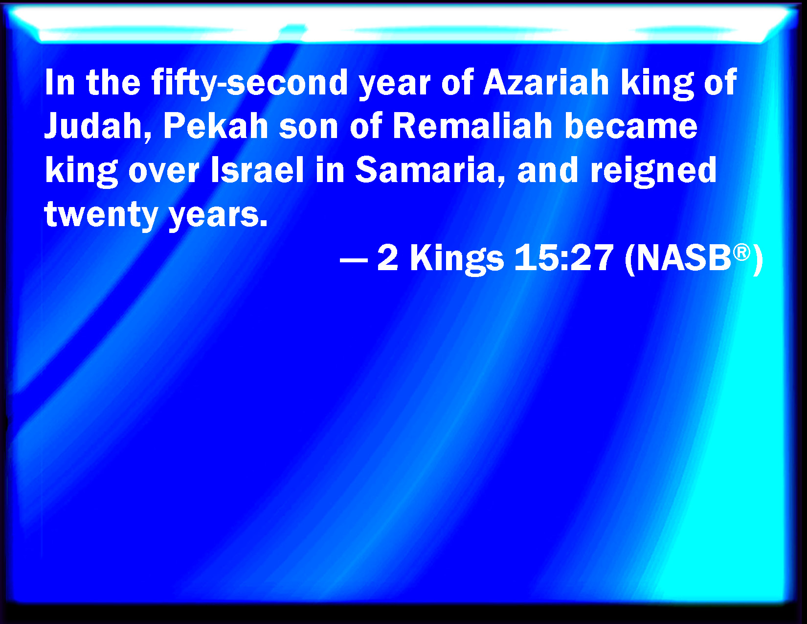 Bible Verse Slide 2 Kings 15:27 In the two and fiftieth year of Azariah king of Judah Pekah the son of Remaliah began to reign over Israel in Samaria, and reigned twenty years. KJV: In the two and fiftieth year of Azariah king of Judah Pekah the son of Remaliah began to reign over Israel in Samaria, and reigned twenty years. DRB: In the two and fiftieth year of Azarias king of Juda reigned Phacee the son of Romelia over Israel in Samaria twenty years. DBT: In the fifty-second year of Azariah king of Judah, Pekah the son of Remaliah began to reign over Israel in Samaria, for twenty years. ERV: In the two and fiftieth year of Azariah king of Judah Pekah the son of Remaliah began to reign over Israel in Samaria, and reigned twenty years. WBT: In the two and fiftieth year of Azariah king of Judah, Pekah the son of Remaliah began to reign over Israel in Samaria, and reigned twenty years. WEB: In the two and fiftieth year of Azariah king of Judah Pekah the son of Remaliah began to reign over Israel in Samaria, [and reigned] twenty years. YLT: In the fifty and second year of Azariah king of Judah, reigned hath Pekah son of Remaliah over Israel, in Samaria — twenty years,Links 2 Kings 15:27 NIV • 2 Kings 15:27 NLT • 2 Kings 15:27 ESV • 2 Kings 15:27 NASB • 2 Kings 15:27 KJV • 2 Kings 15:27 Interlinear • 2 Kings 15:27 Commentaries • 2 Kings 15:27 Parallel Texts • 2 Kings 15:27 Bible Apps • 2 Kings 15:27 Parallel • Bible Hub |