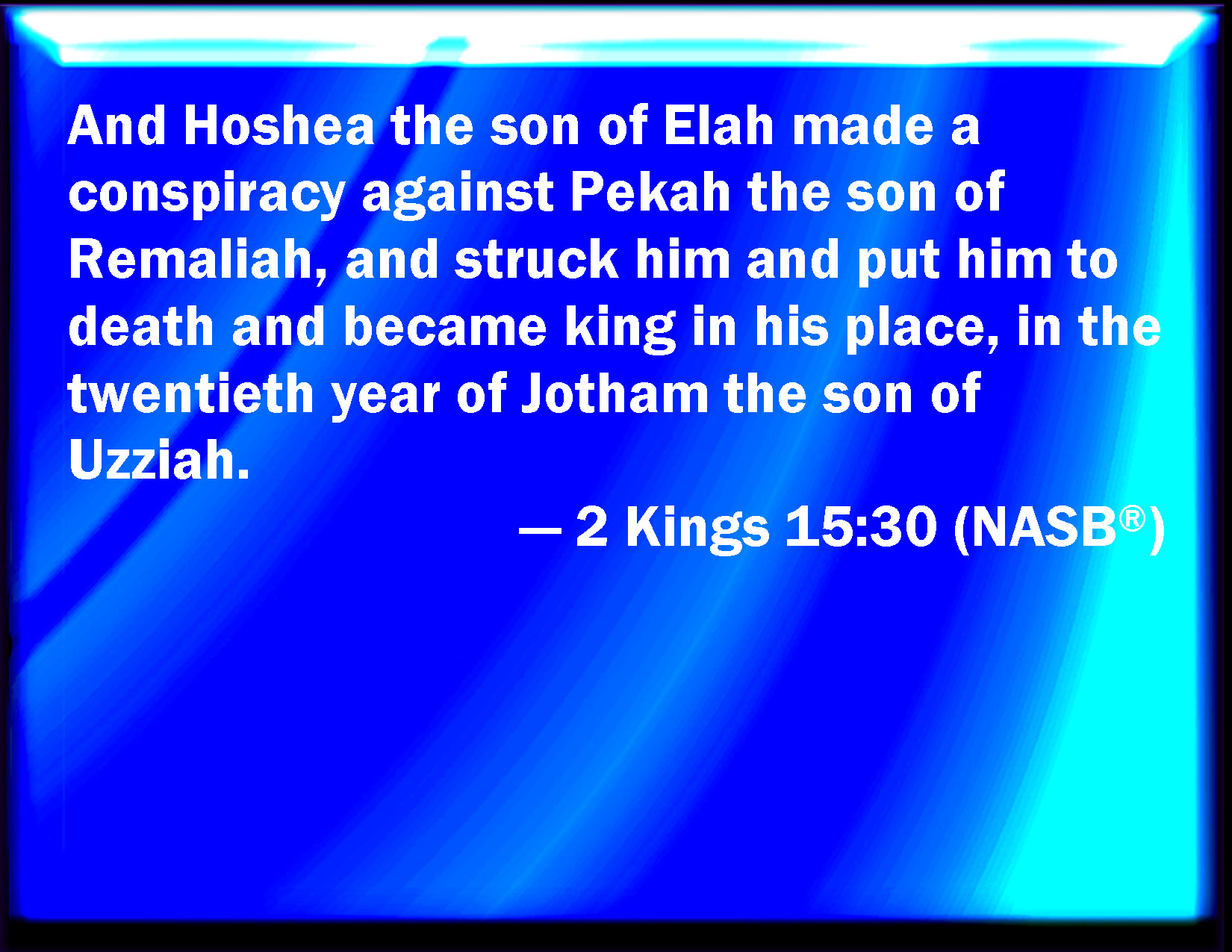 Bible Verse Slide 2 Kings 15:30 And Hoshea the son of Elah made a conspiracy against Pekah the son of Remaliah, and smote him, and slew him, and reigned in his stead, in the twentieth year of Jotham the son of Uzziah. KJV: And Hoshea the son of Elah made a conspiracy against Pekah the son of Remaliah, and smote him, and slew him, and reigned in his stead, in the twentieth year of Jotham the son of Uzziah. DRB: Now Osee son of Ela conspired, and formed a plot against Phacee, the son of Romelia, and struck him, and slew him: and reigned in his stead in the twentieth year of Joatham the son of Ozias. DBT: And Hoshea the son of Elah made a conspiracy against Pekah the son of Remaliah, and smote him and slew him; and he reigned in his stead, in the twentieth year of Jotham the son of Uzziah. ERV: And Hoshea the son of Elah made a conspiracy against Pekah the son of Remaliah, and smote him, and slew him, and reigned in his stead, in the twentieth year of Jotham the son of Uzziah. WBT: And Hoshea the son of Elah made a conspiracy against Pekah the son of Remaliah, and smote him, and slew him, and reigned in his stead, in the twentieth year of Jotham the son of Uzziah. WEB: Hoshea the son of Elah made a conspiracy against Pekah the son of Remaliah, and struck him, and killed him, and reigned in his place, in the twentieth year of Jotham the son of Uzziah. YLT: And make a conspiracy doth Hoshea son of Elah against Pekah son of Remaliah, and smiteth him, and putteth him to death, and reigneth in his stead, in the twentieth year of Jotham son of Uzziah.Links 2 Kings 15:30 NIV • 2 Kings 15:30 NLT • 2 Kings 15:30 ESV • 2 Kings 15:30 NASB • 2 Kings 15:30 KJV • 2 Kings 15:30 Interlinear • 2 Kings 15:30 Commentaries • 2 Kings 15:30 Parallel Texts • 2 Kings 15:30 Bible Apps • 2 Kings 15:30 Parallel • Bible Hub |